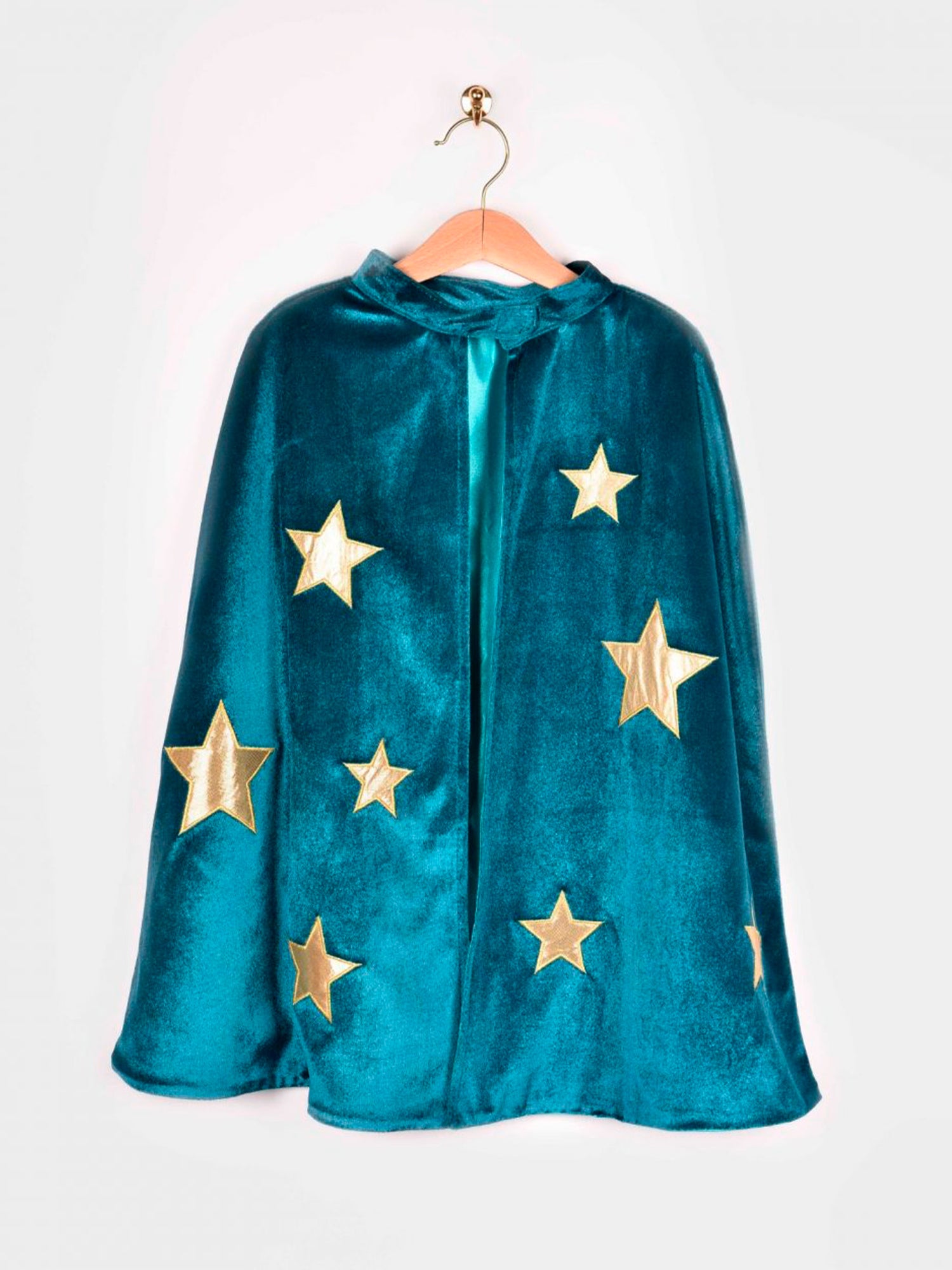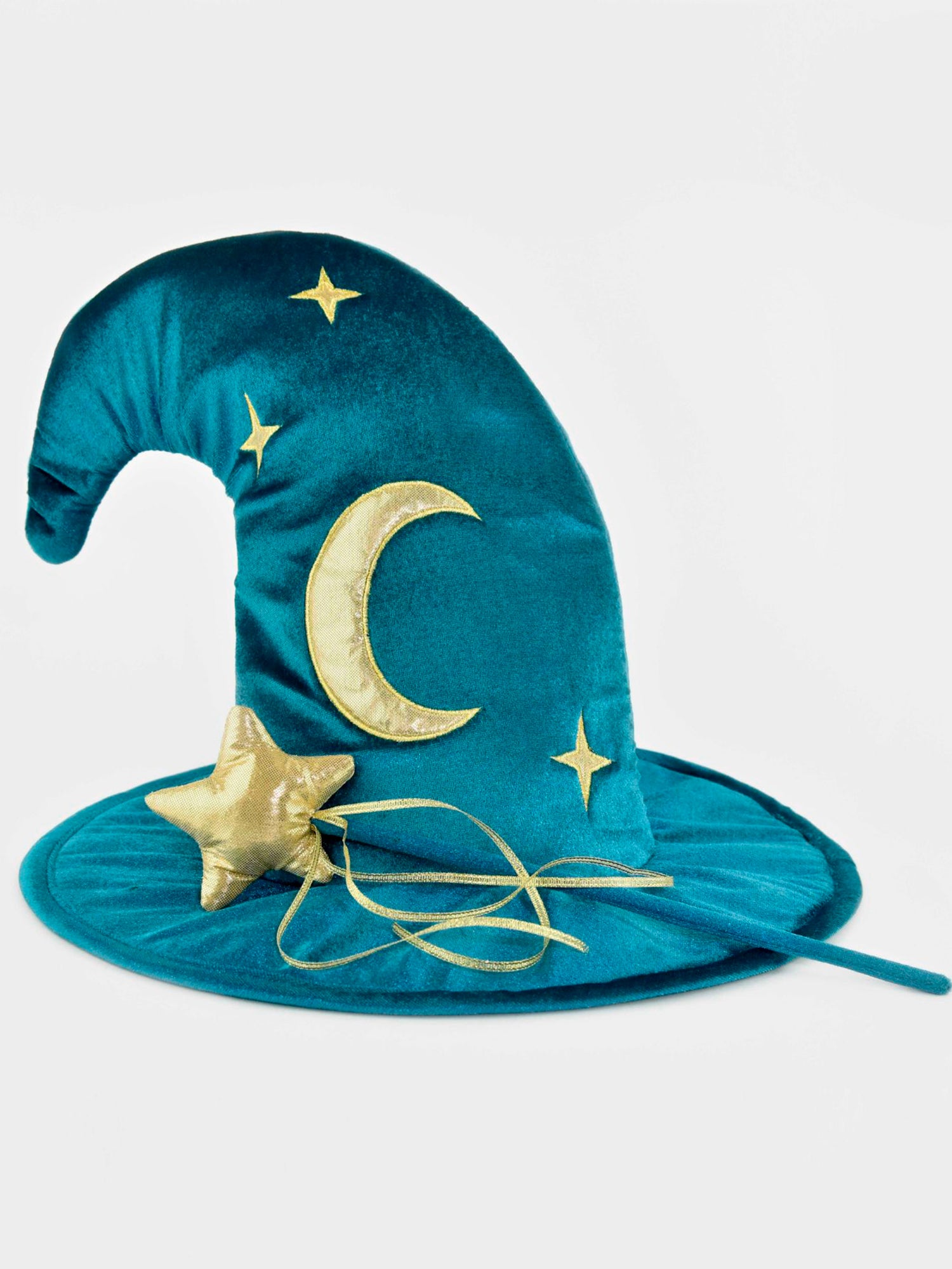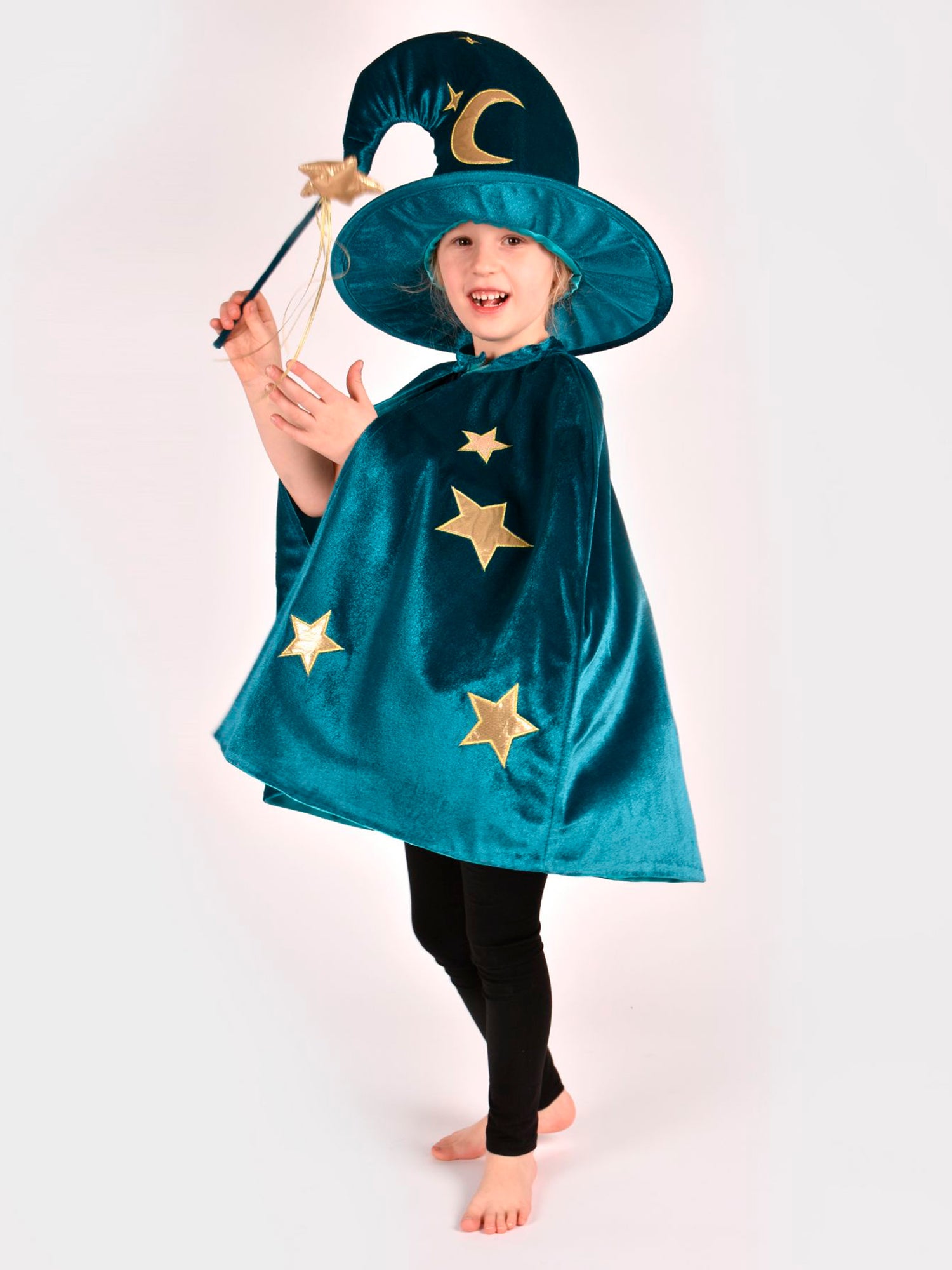 Teal wizard costume with gold stars that includes a cape, hat and matching wand.