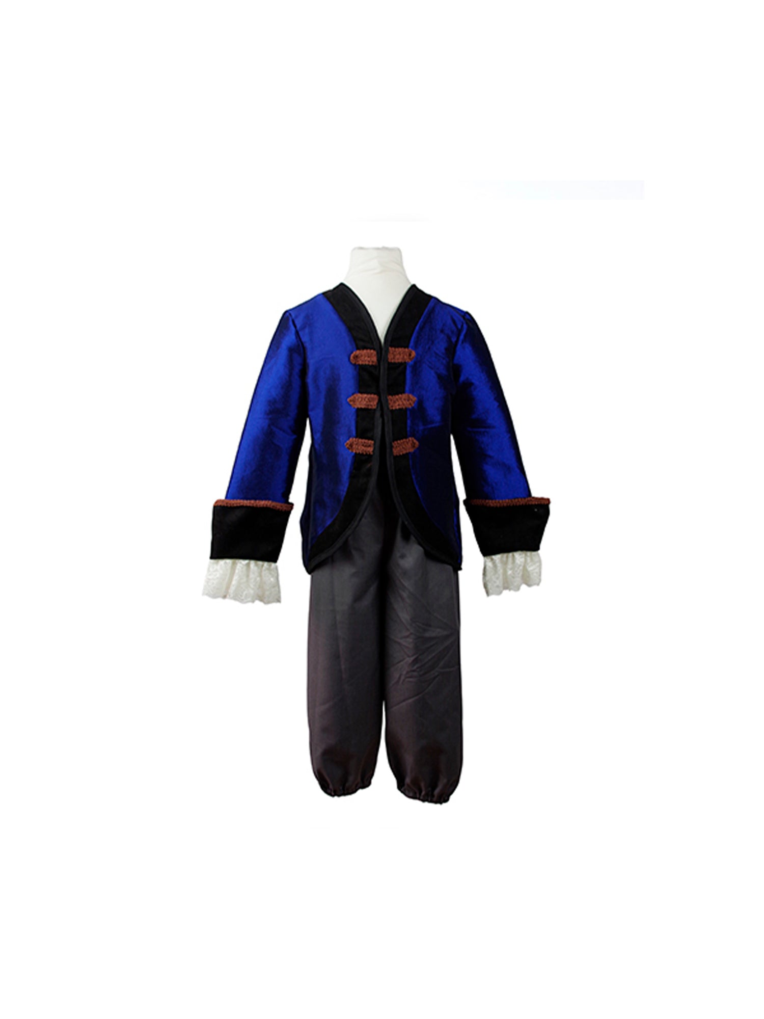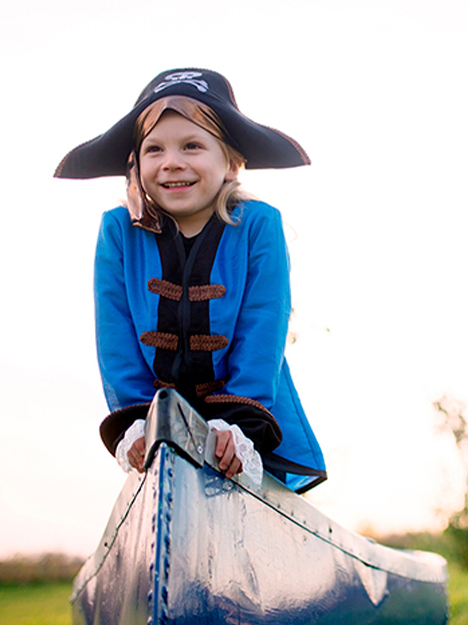 Argh! This 3-piece pirate set comes fully equipped for the open sea! The grey pants have an elastic waist for sizing flexibility, the royal blue shirt has cuffed sleeves. No pirate is complete without their pirate hat! This 3-pointed hat features a pirate skull and bones emblem on the front.