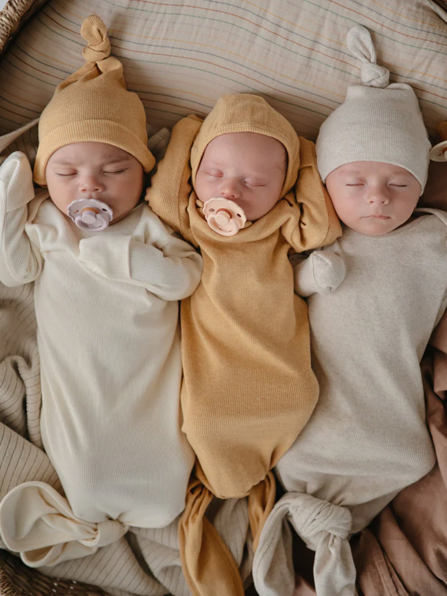Beautiful baby hat designed and thinking for newborns. The beanie is made from organic cotton and features a stretchy, lightweight design with a knot at the top, perfect for keeping those little ears warm. Parents and babies alike will love the extra soft knot material.