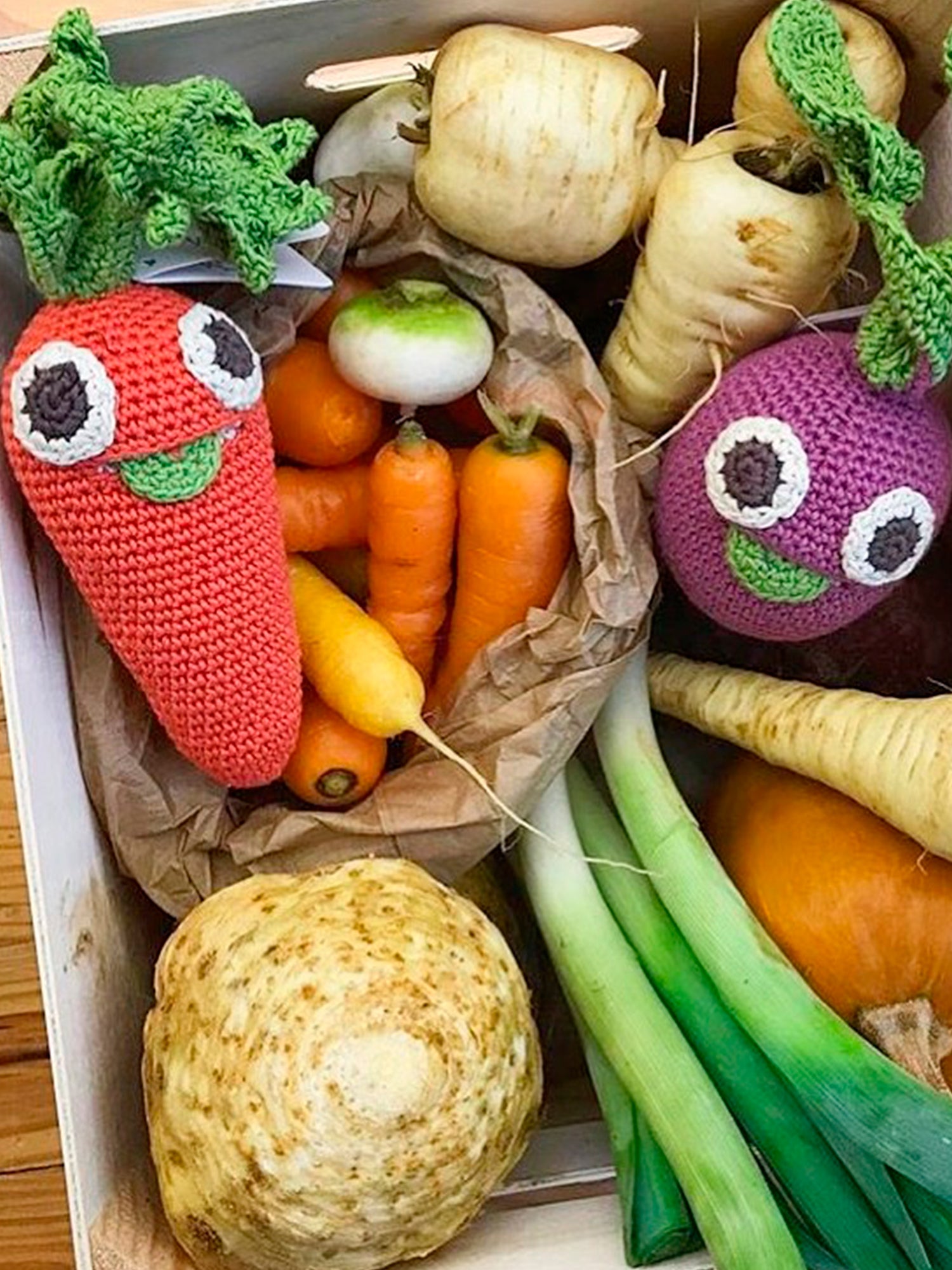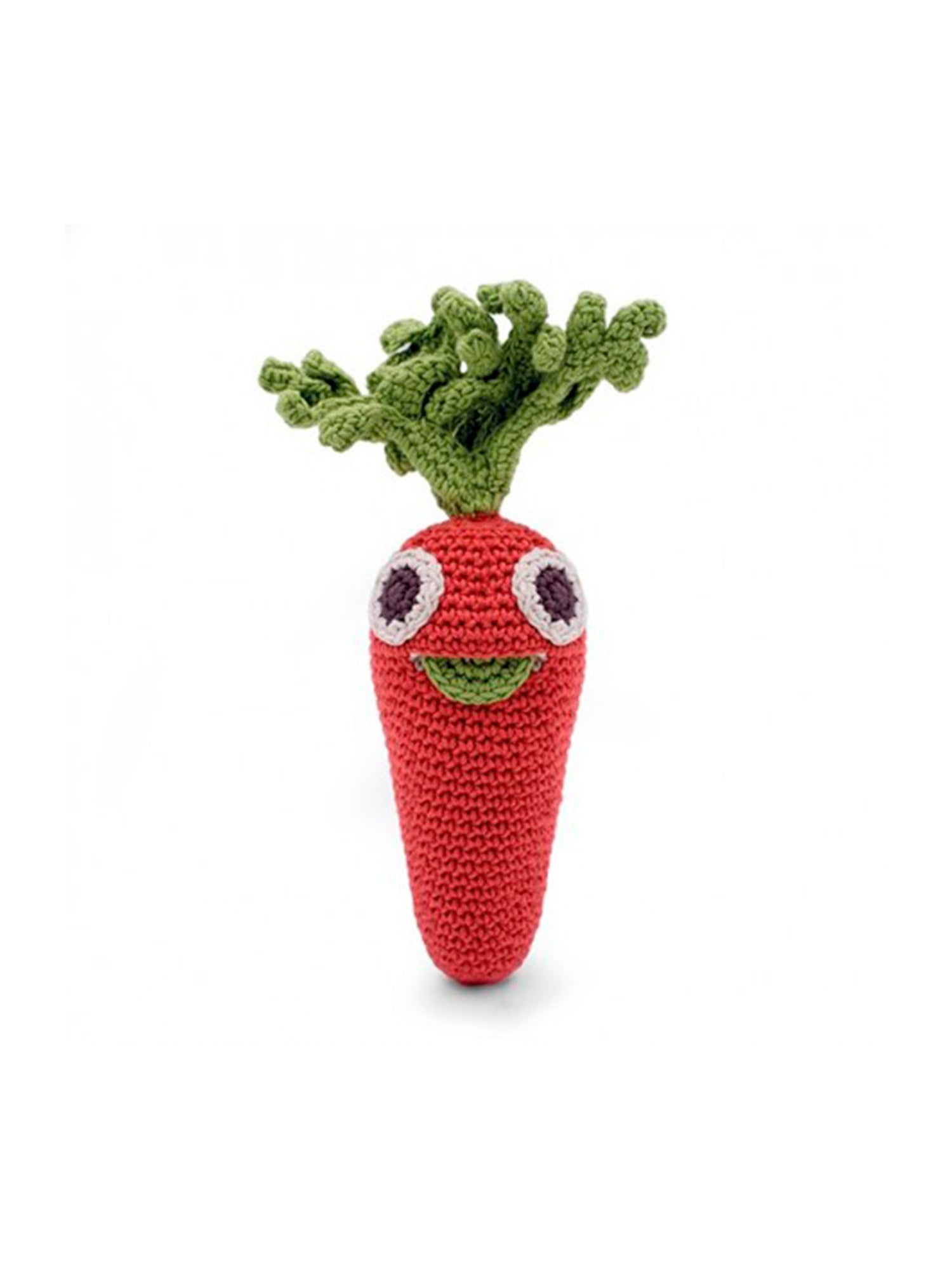 It is handmade crochet. It is 100% organic cotton. Its texture and its bell help to awaken the senses and its carrot shape is designed to make babies aware of Nature and healthy eating.