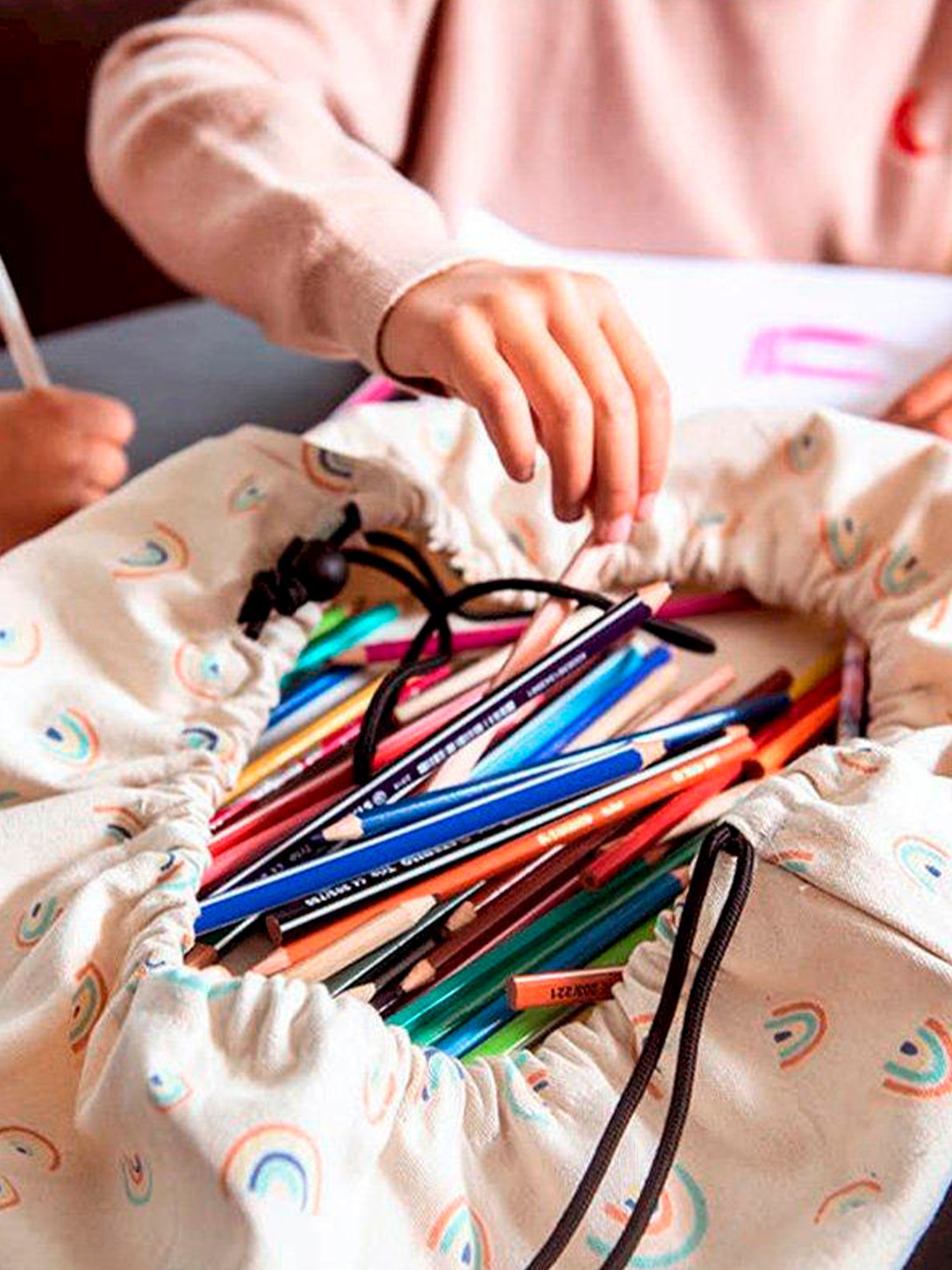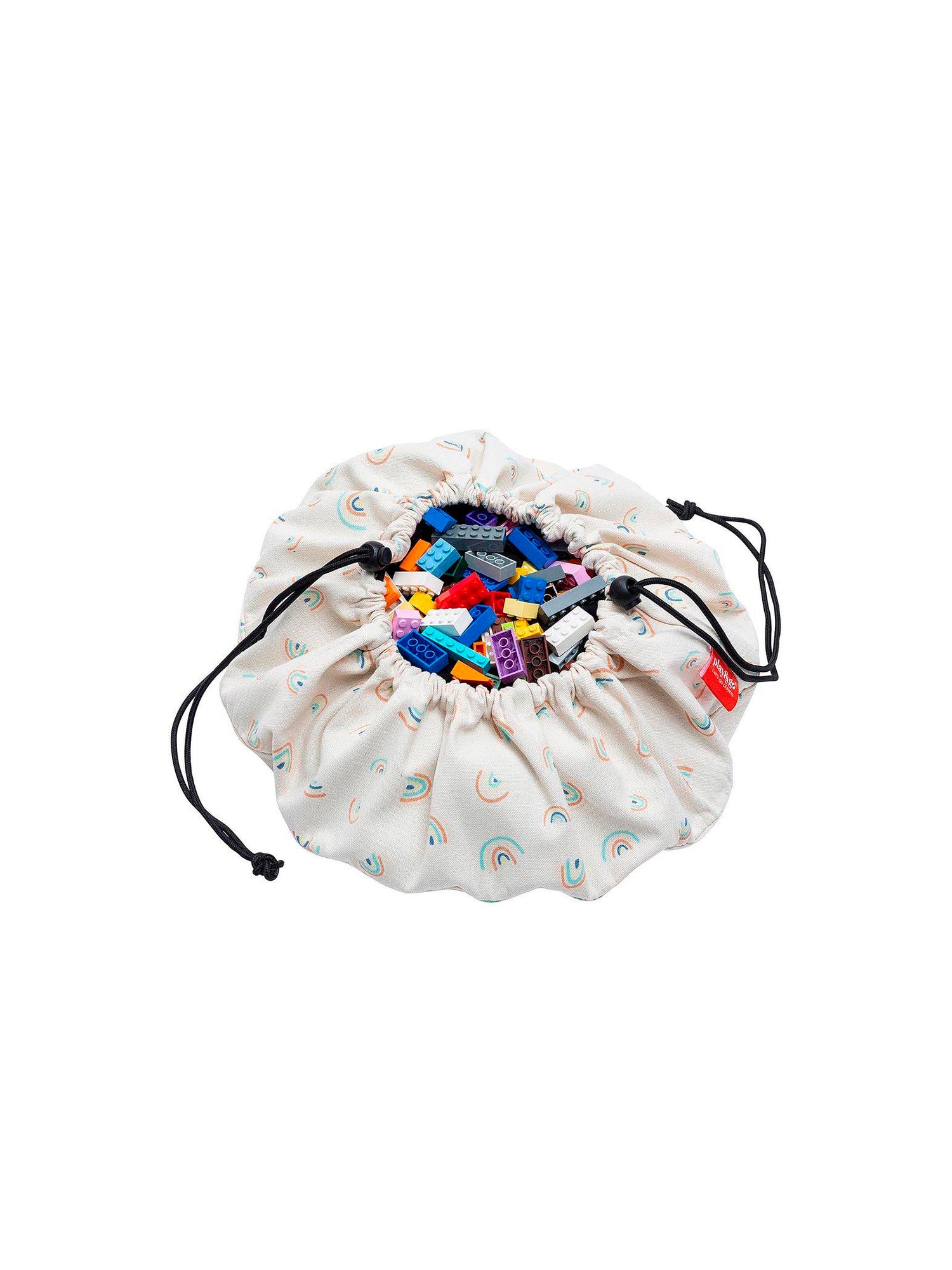The bag unfolds and becomes a play mat. When it's time to put it away, just zip it up and that's it. Everything is packed away!