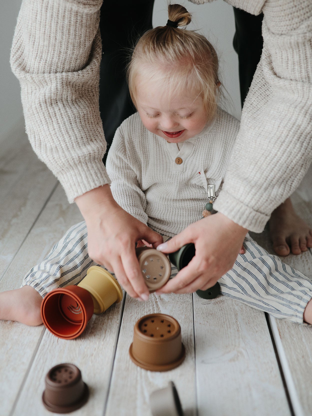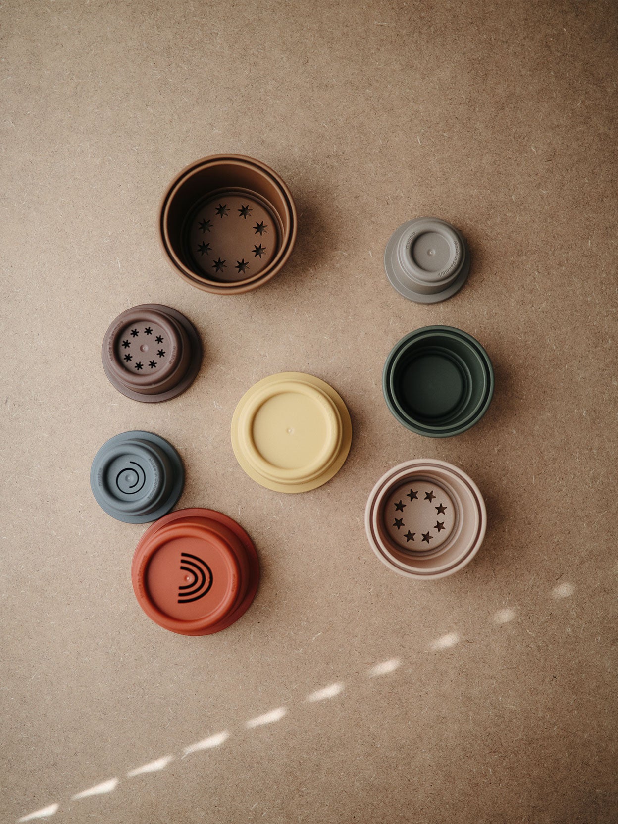 Mushie's stackable cups also help children learn language skills. In pastel colors , each cup has a different perforated drawing to play with sand or water. From 6 months Designed and manufactured in Denmark .