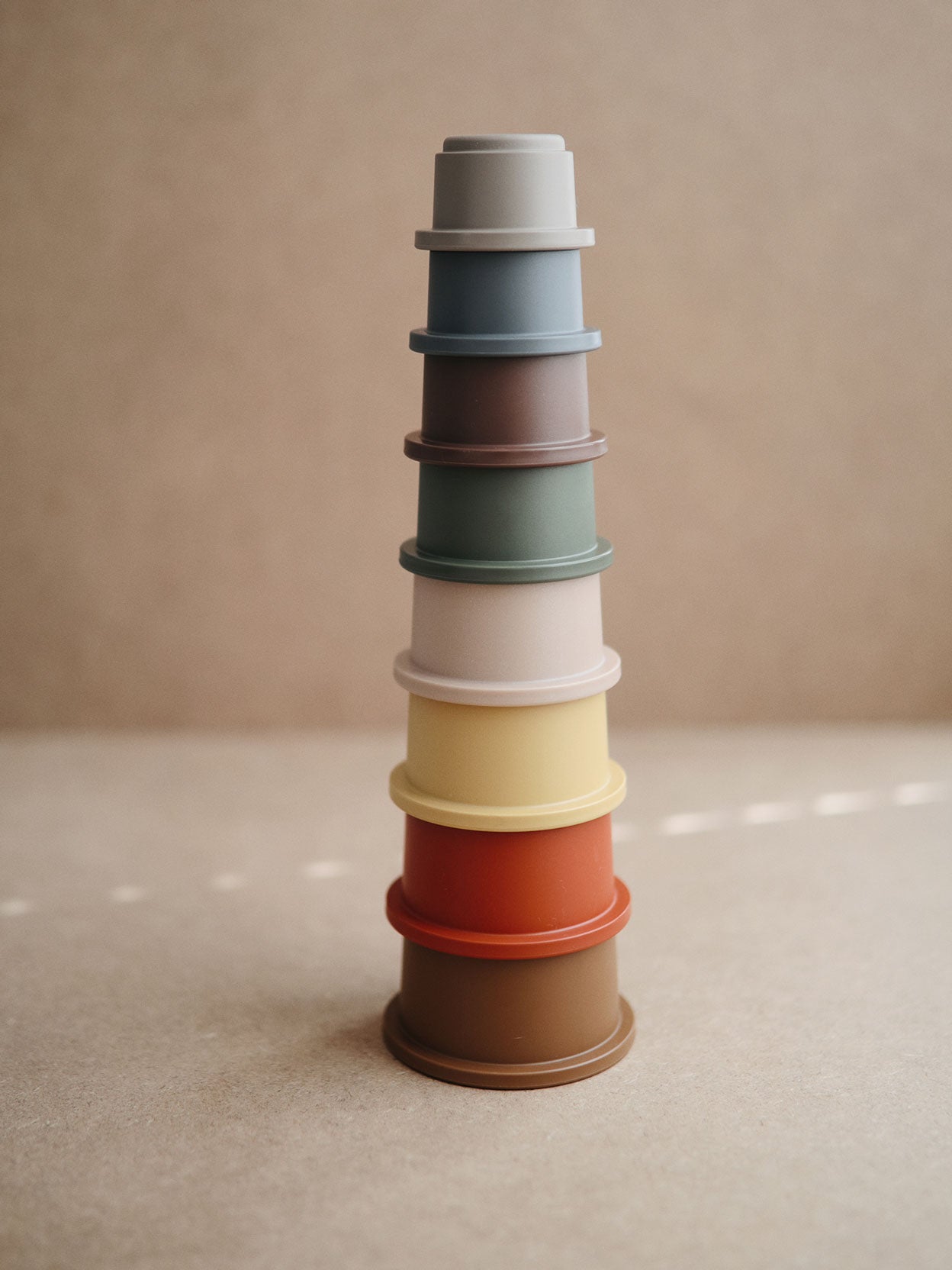 Mushie's stacking toys help develop the body and brain from around six months. Helps improve fine motor skills. Basic skills learned from stacking toys become the foundation for more complex tasks like using a writing instrument.