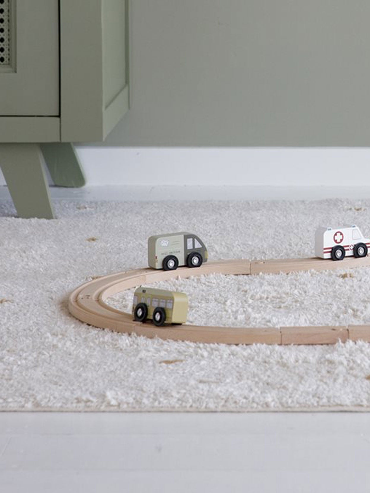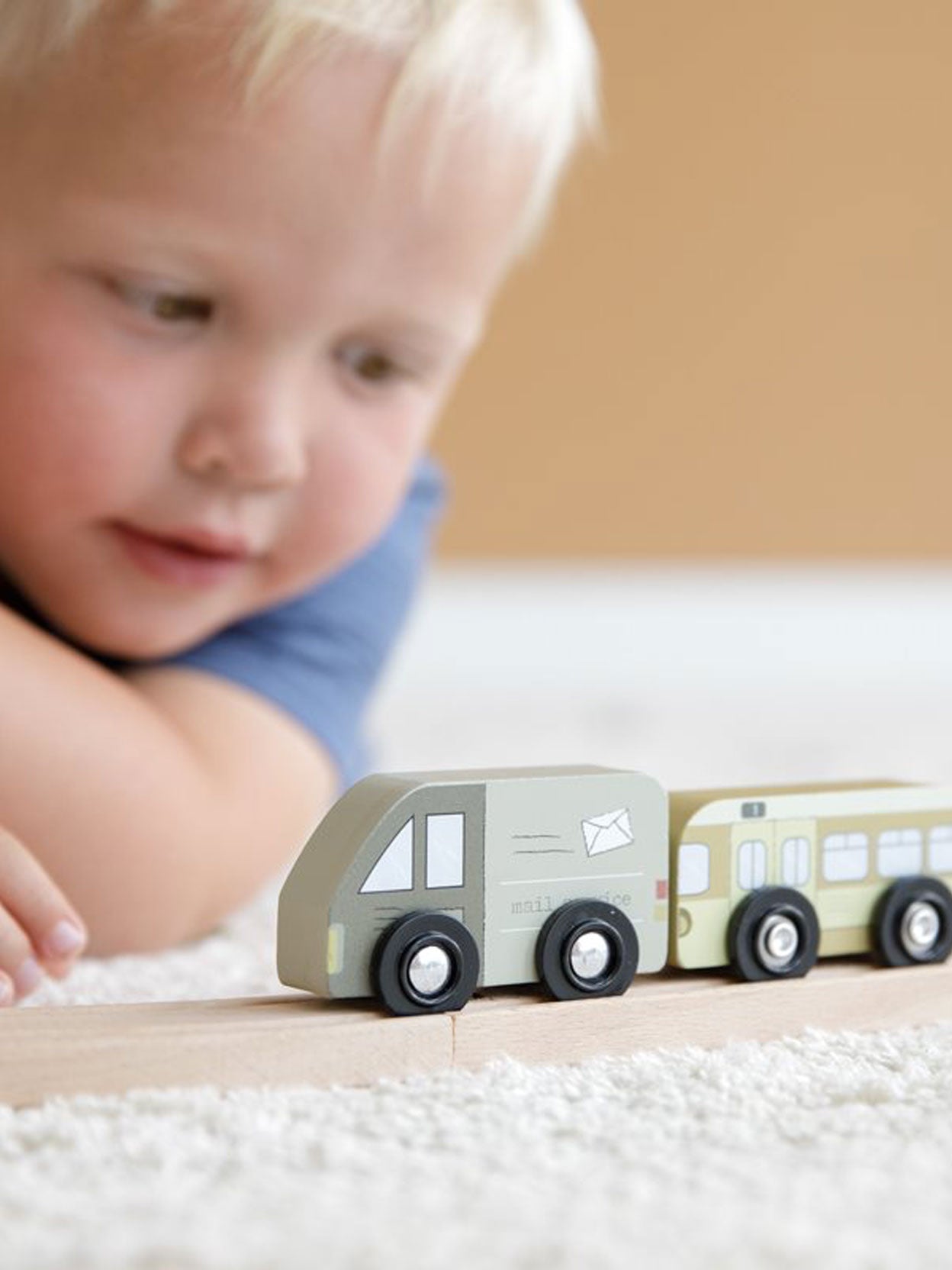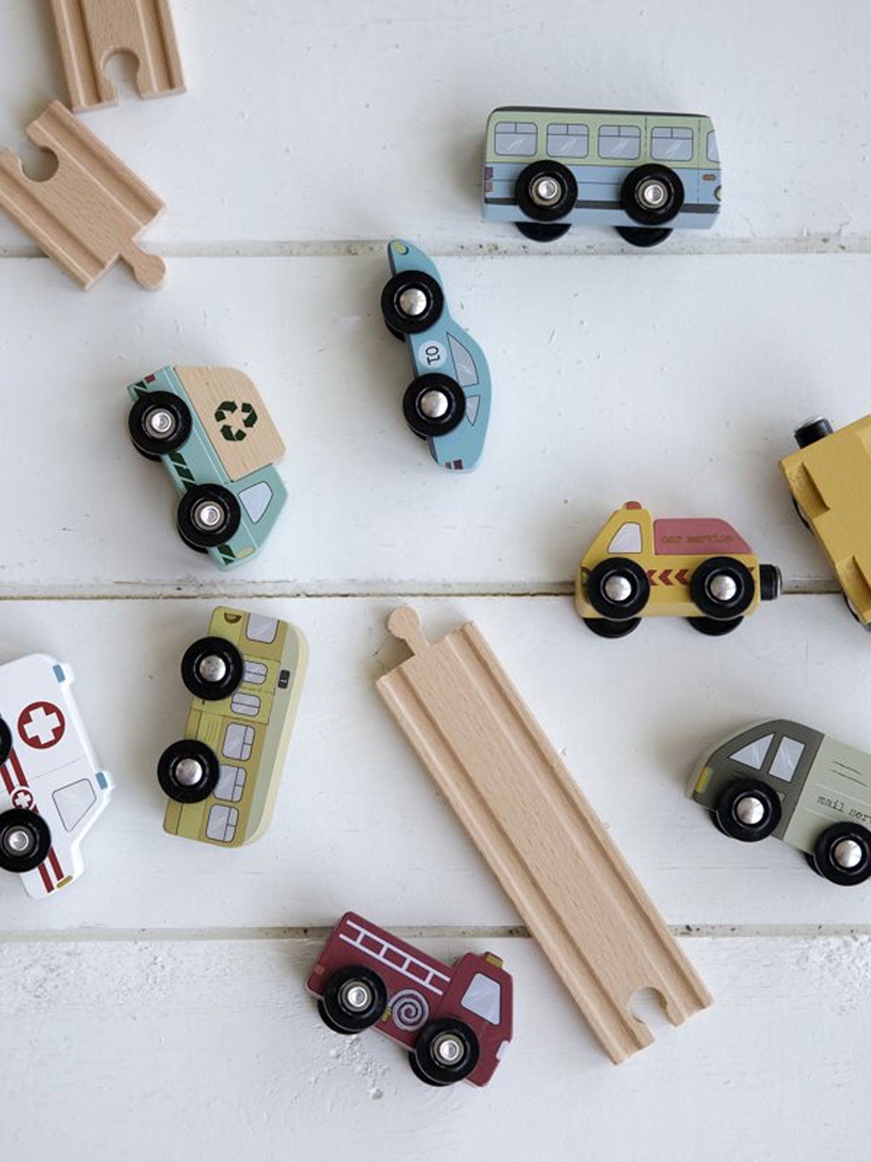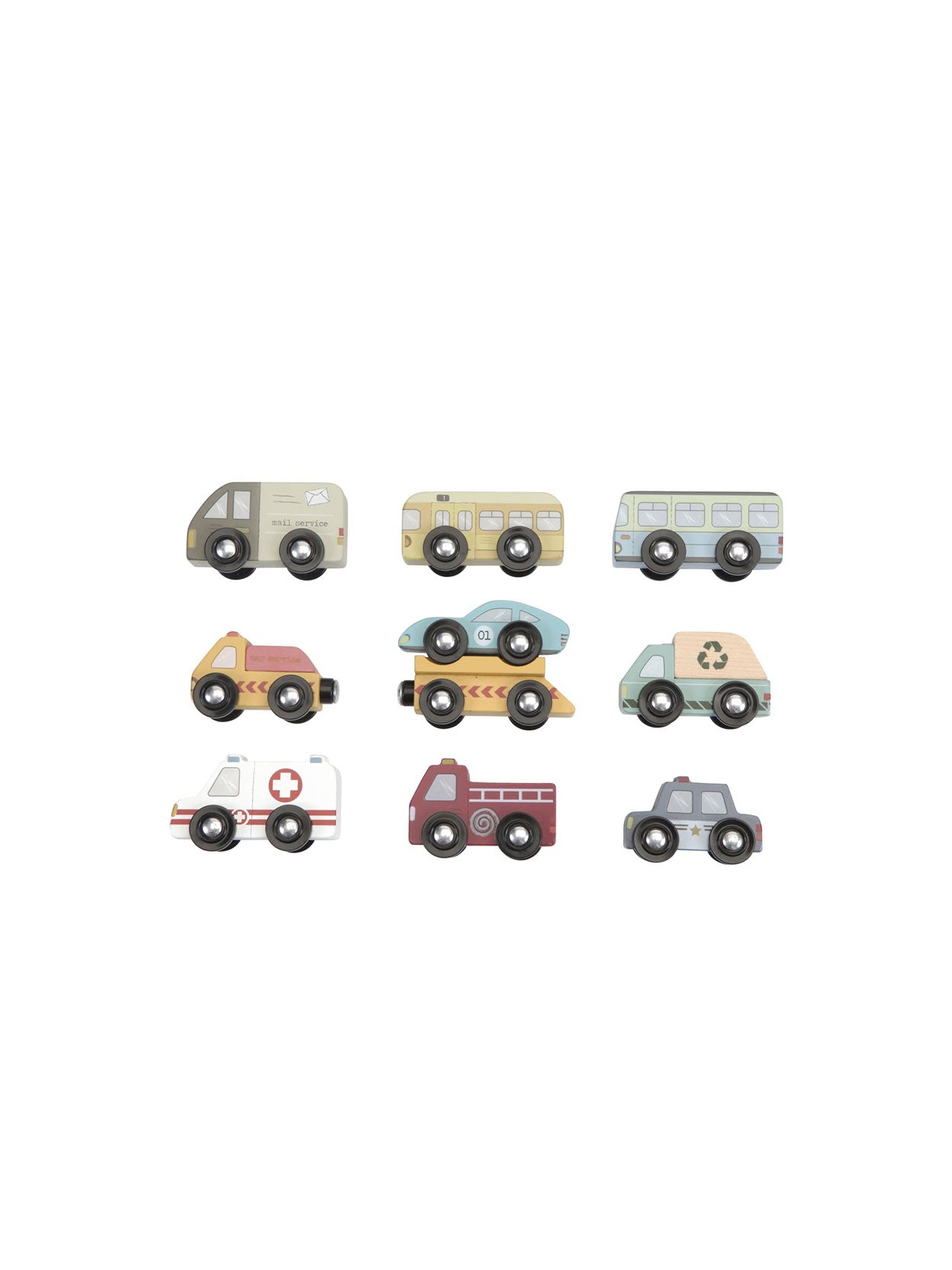 Nine wooden service and emergency vehicles designed to be used in combination with the Little Dutch wooden train.