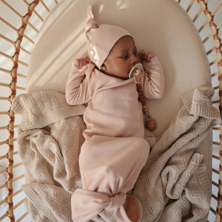 Un precioso body anudado diseñado pensando en los recién nacidos. El body está hecho de algodón orgánico y presenta un cierre ajustable, puños de manga doblados y superposiciones de hombros. El diseño anudado mantiene los pies del bebé seguros y facilita los cambios de pañales. El material de punto acanalado asegura que el bebé se mantenga cómodo y recogido durante toda la noche