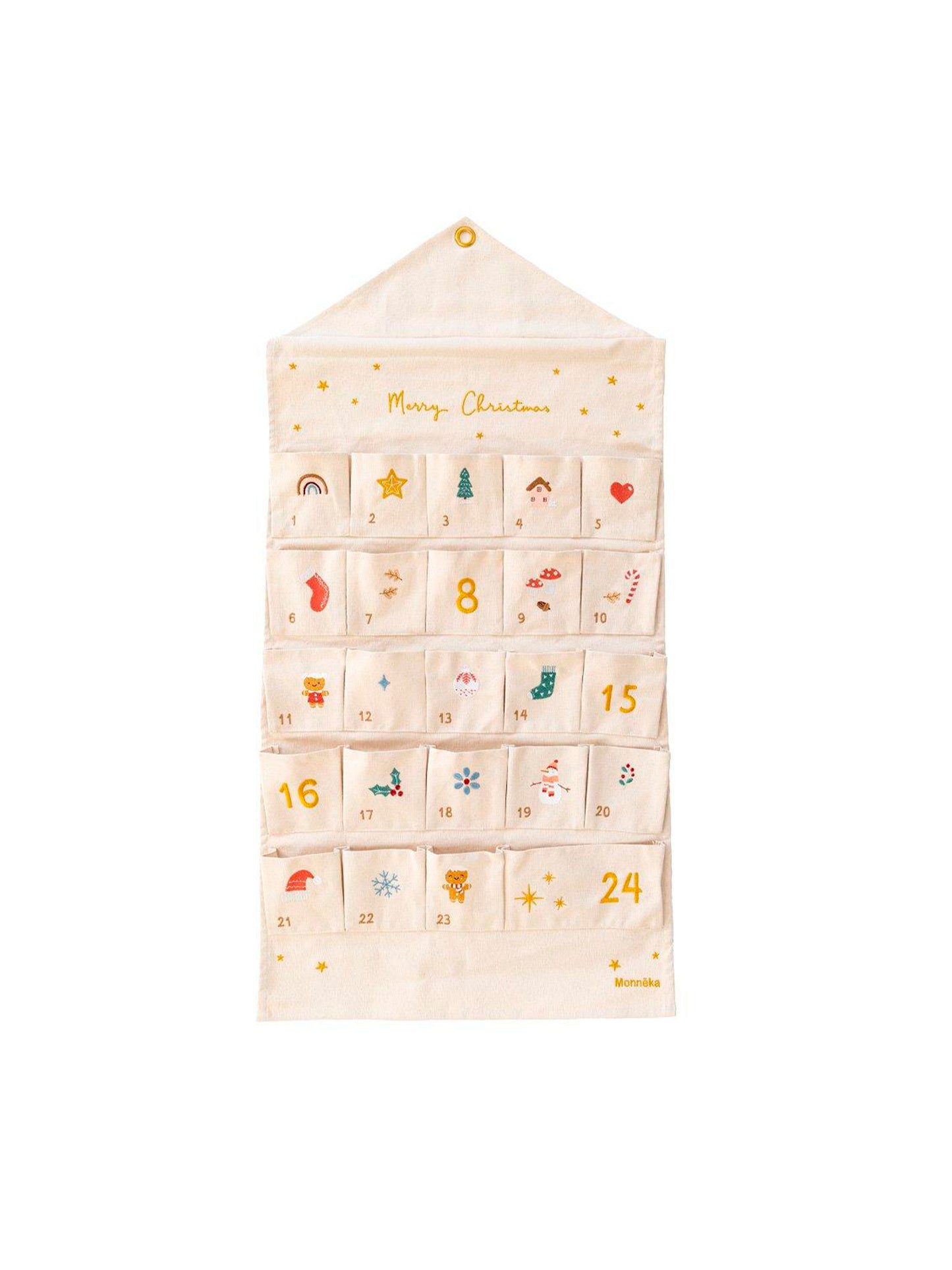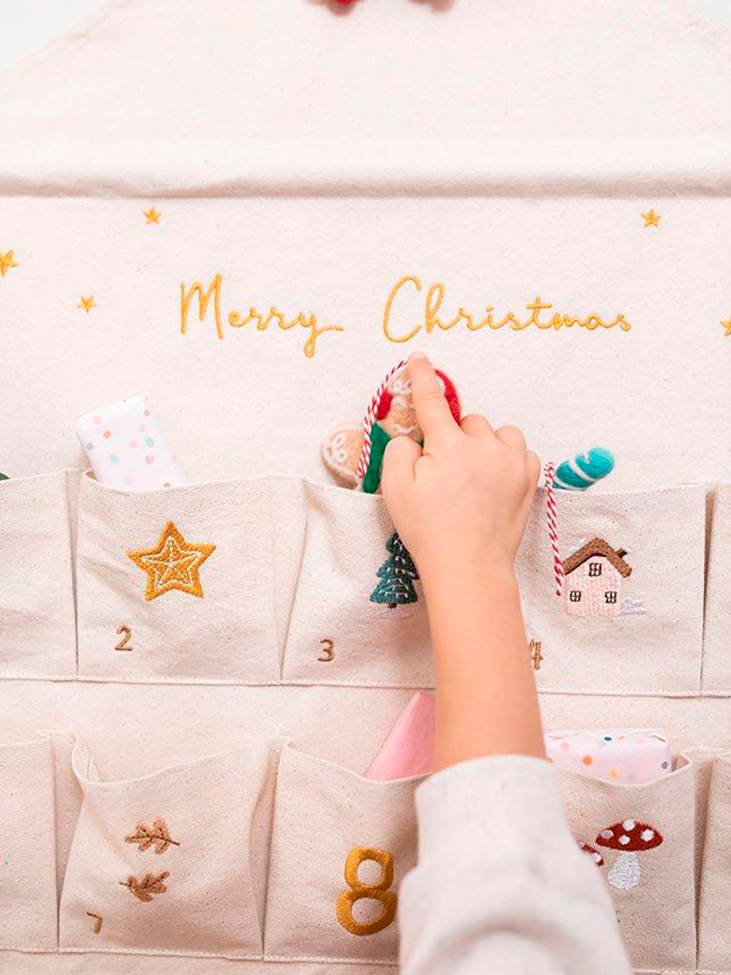 Calendario de pared, salpicado de nostálgicas figuras navideñas y decorado con borlas y pompones, tiene 24 bolsillos con pequeños lazos para llenar con pequeñas sorpresas que hacen que cada día sea especial, mientras hacemos la cuenta regresiva hasta navidad. Con agujero para colgar en la pared.