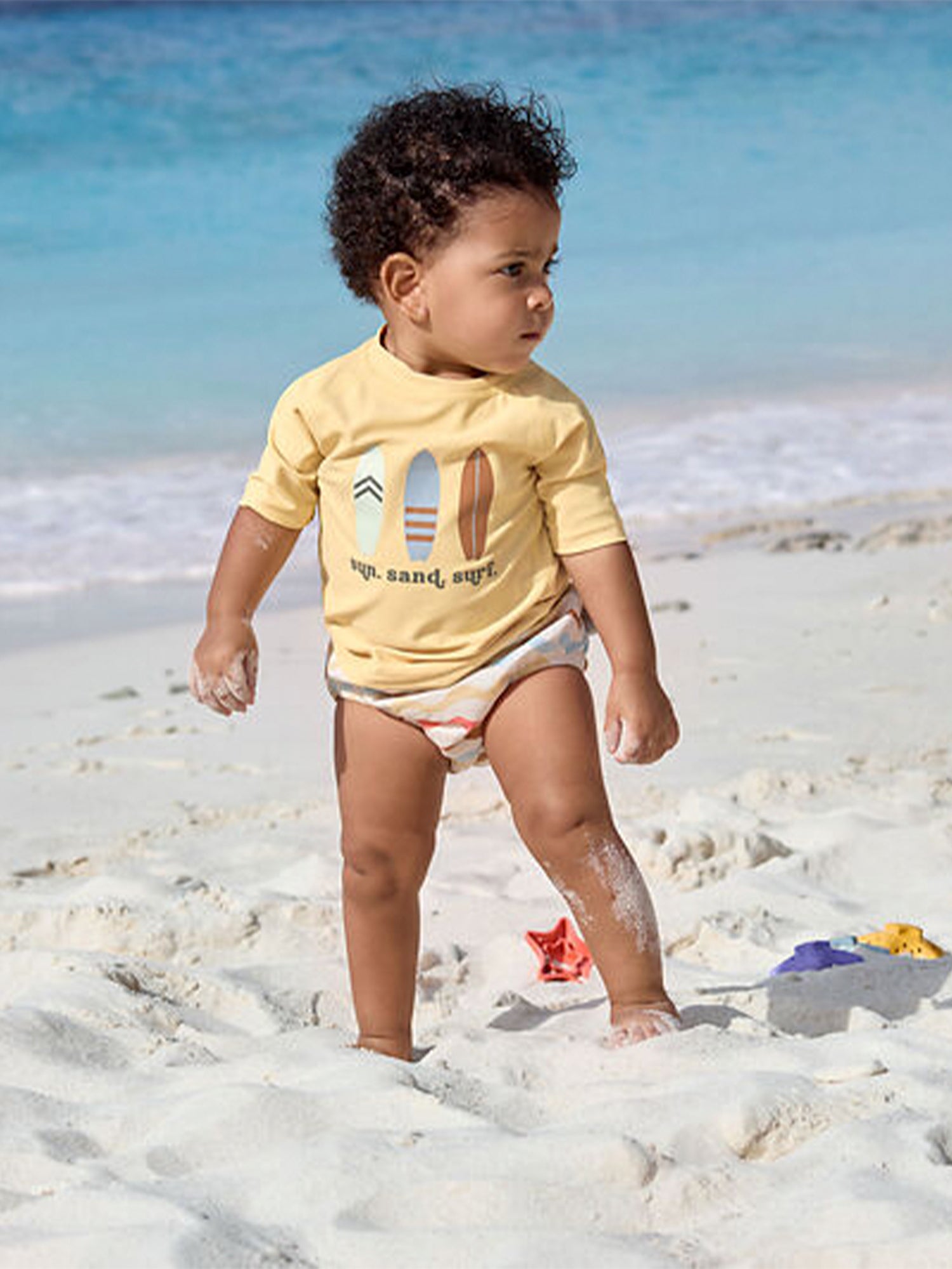 La camiseta de manga corta LÄSSIG UV hecha de poliéster reciclado garantiza diversión sin preocupaciones en el agua con protección UV 60 y estampados divertidos.