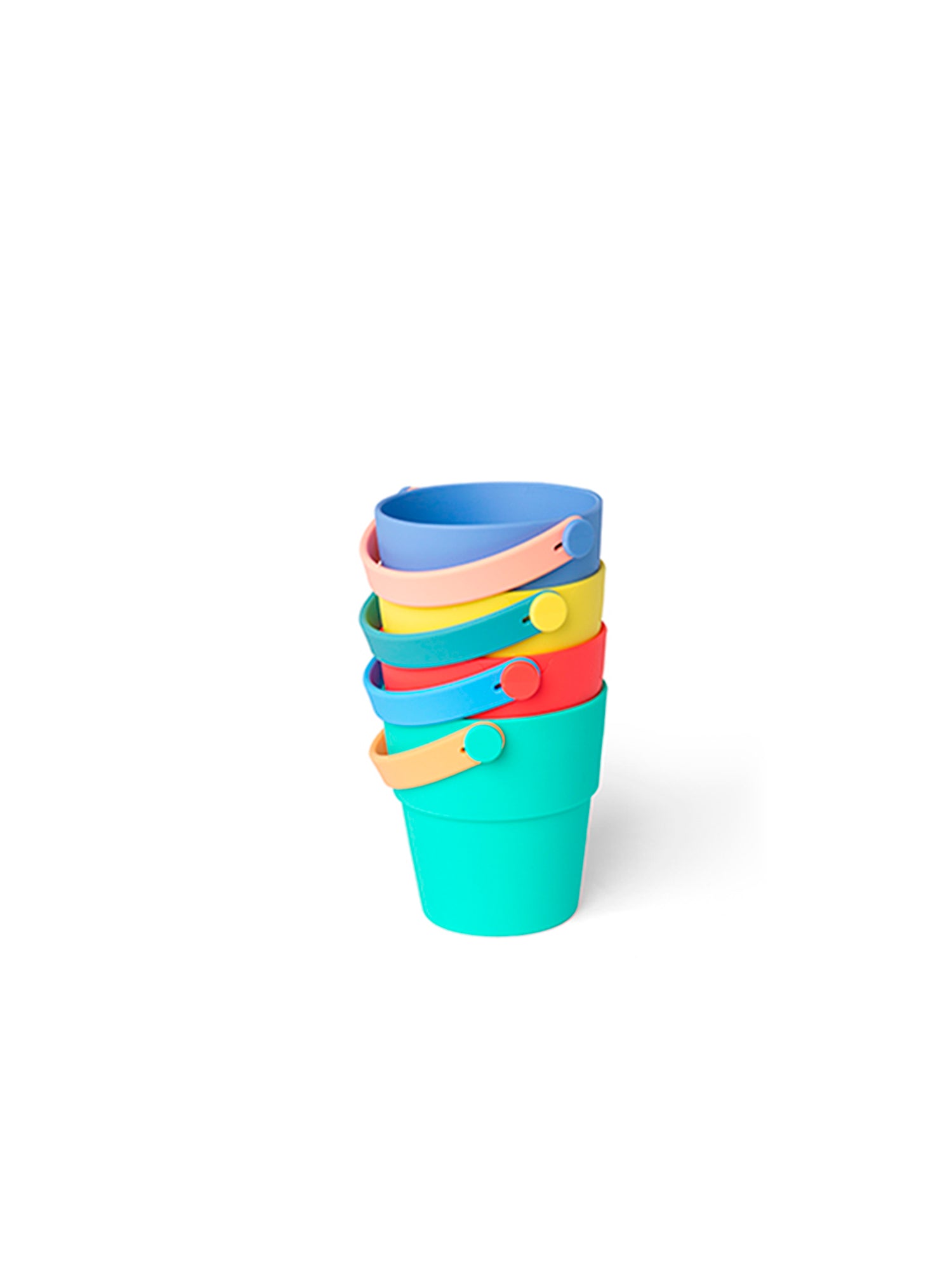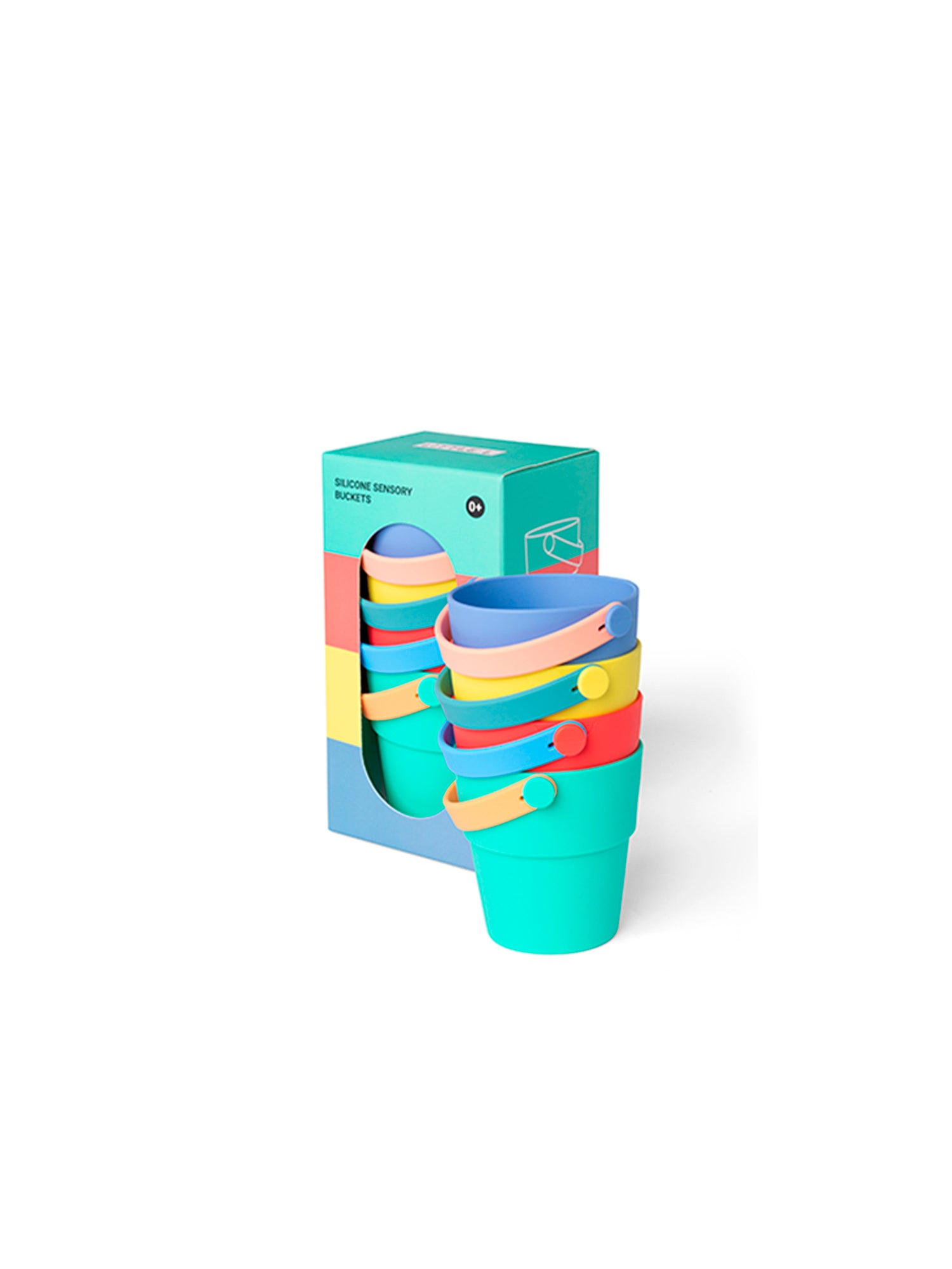 Con estos cuatro cubitos de silicona con asa cada uno, podemos trasladar agua del uno al otro y jugar a mil juegos dejando ir la imaginación.