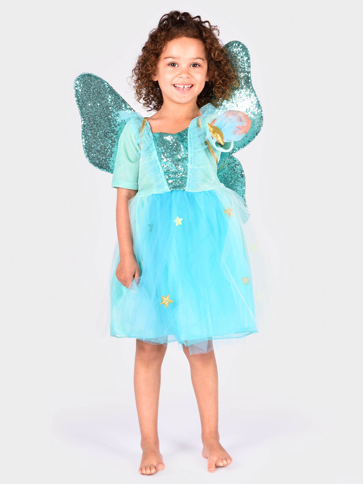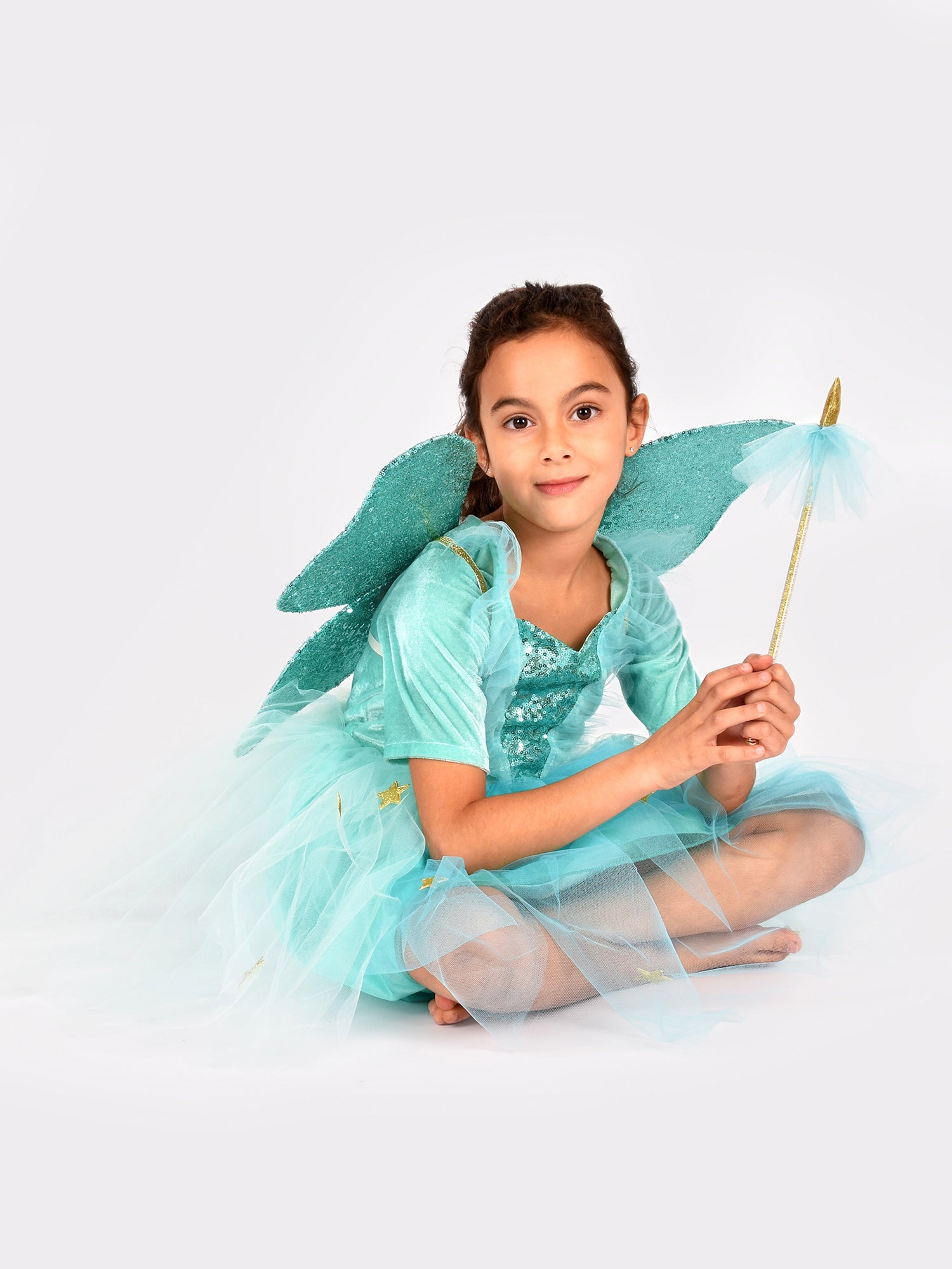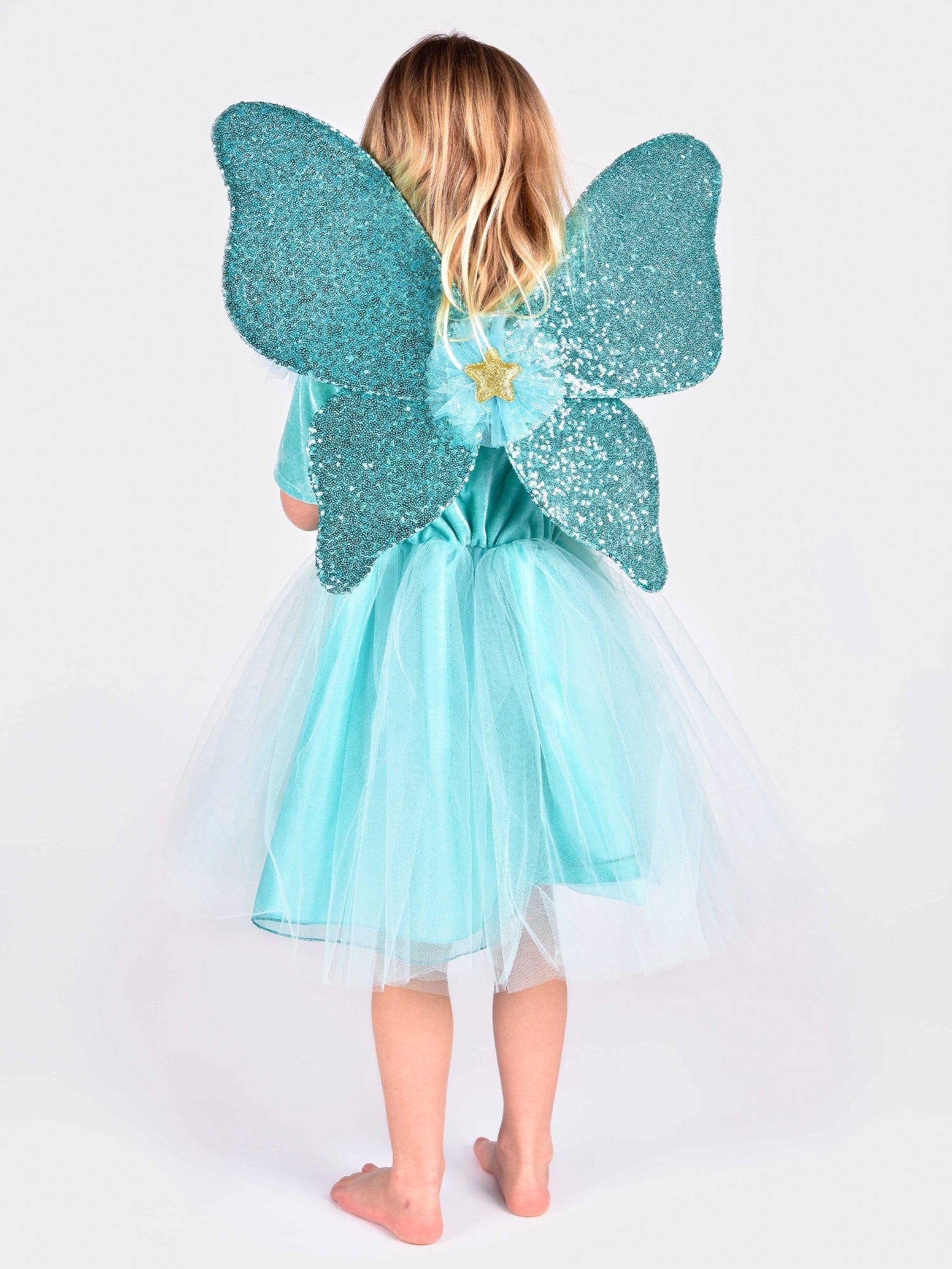Disfraz en color turquesa que incluye el vestido, las alas y la varita.