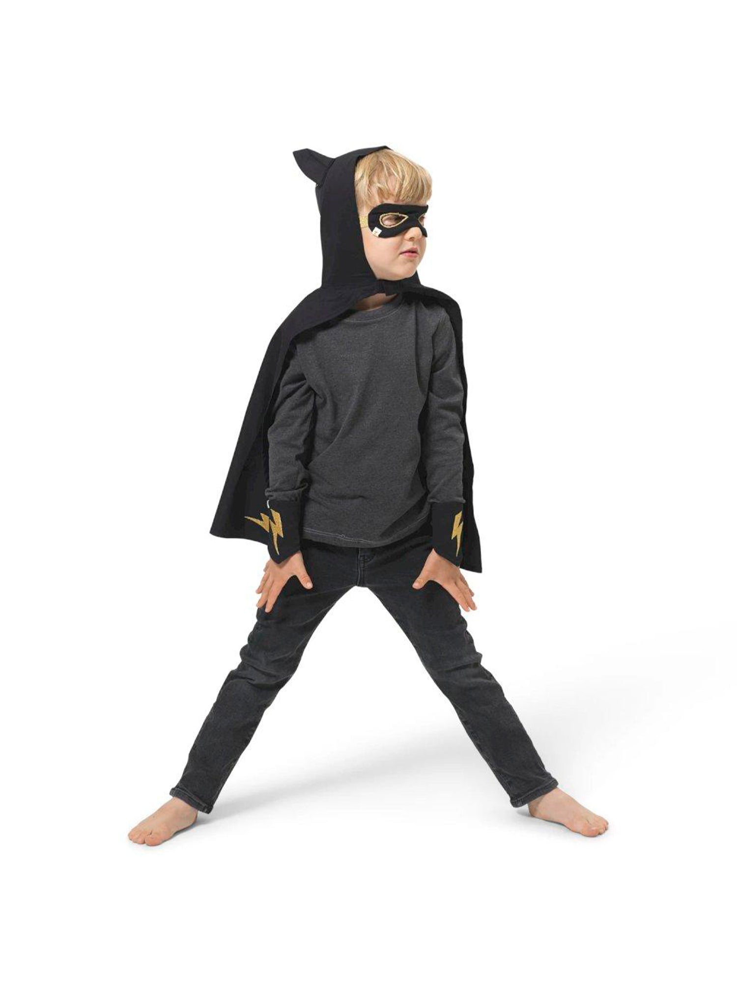 Disfraz de súper héroe o heroína con una capa con unas simpáticas orejas y una máscara.