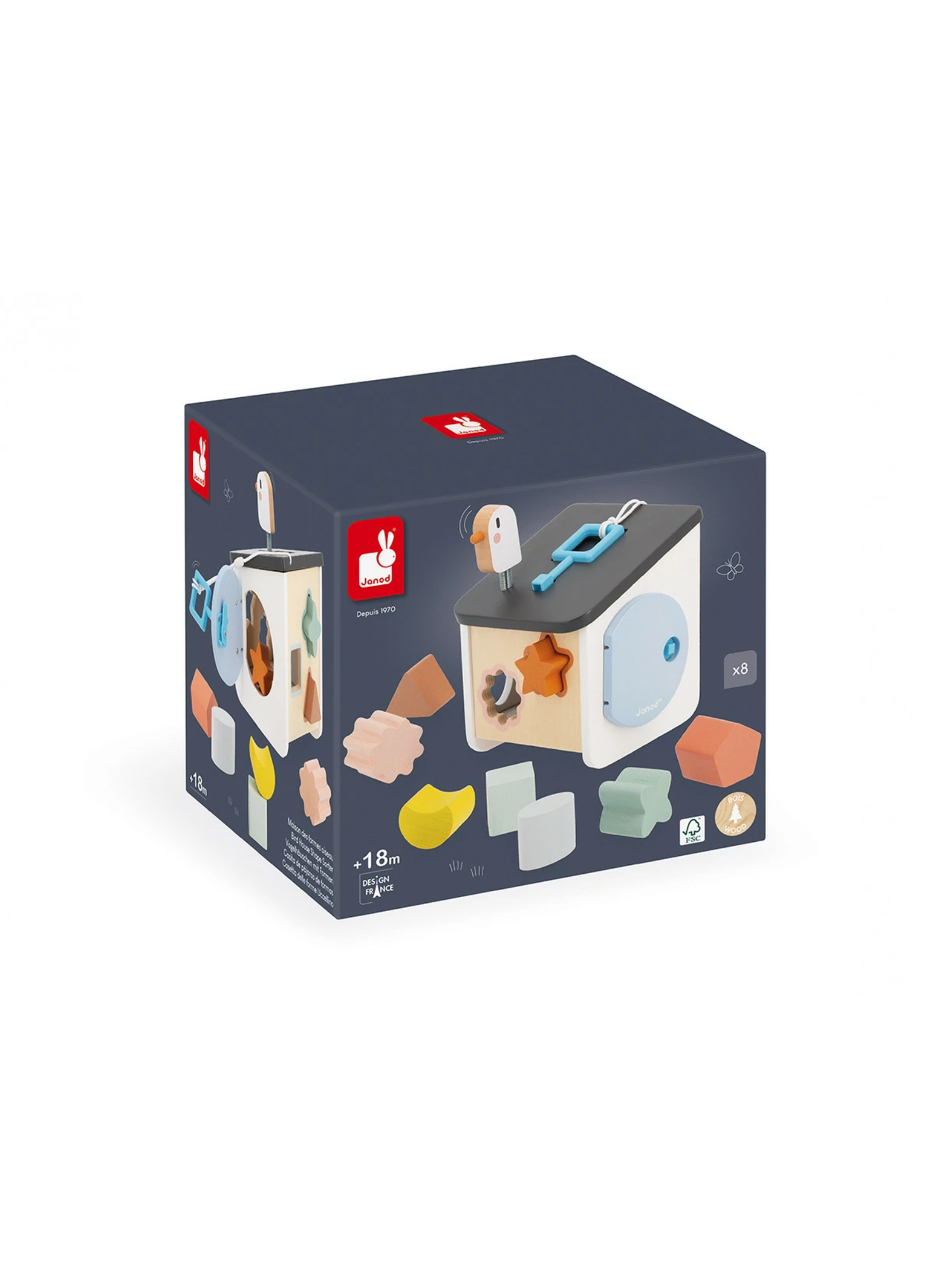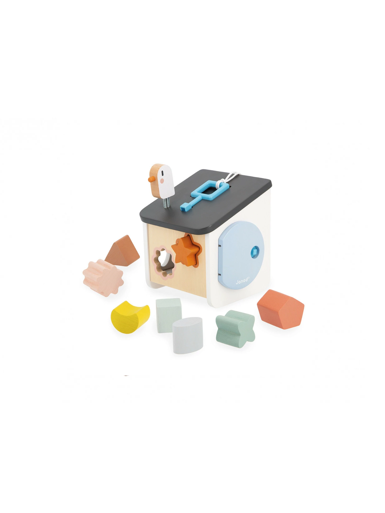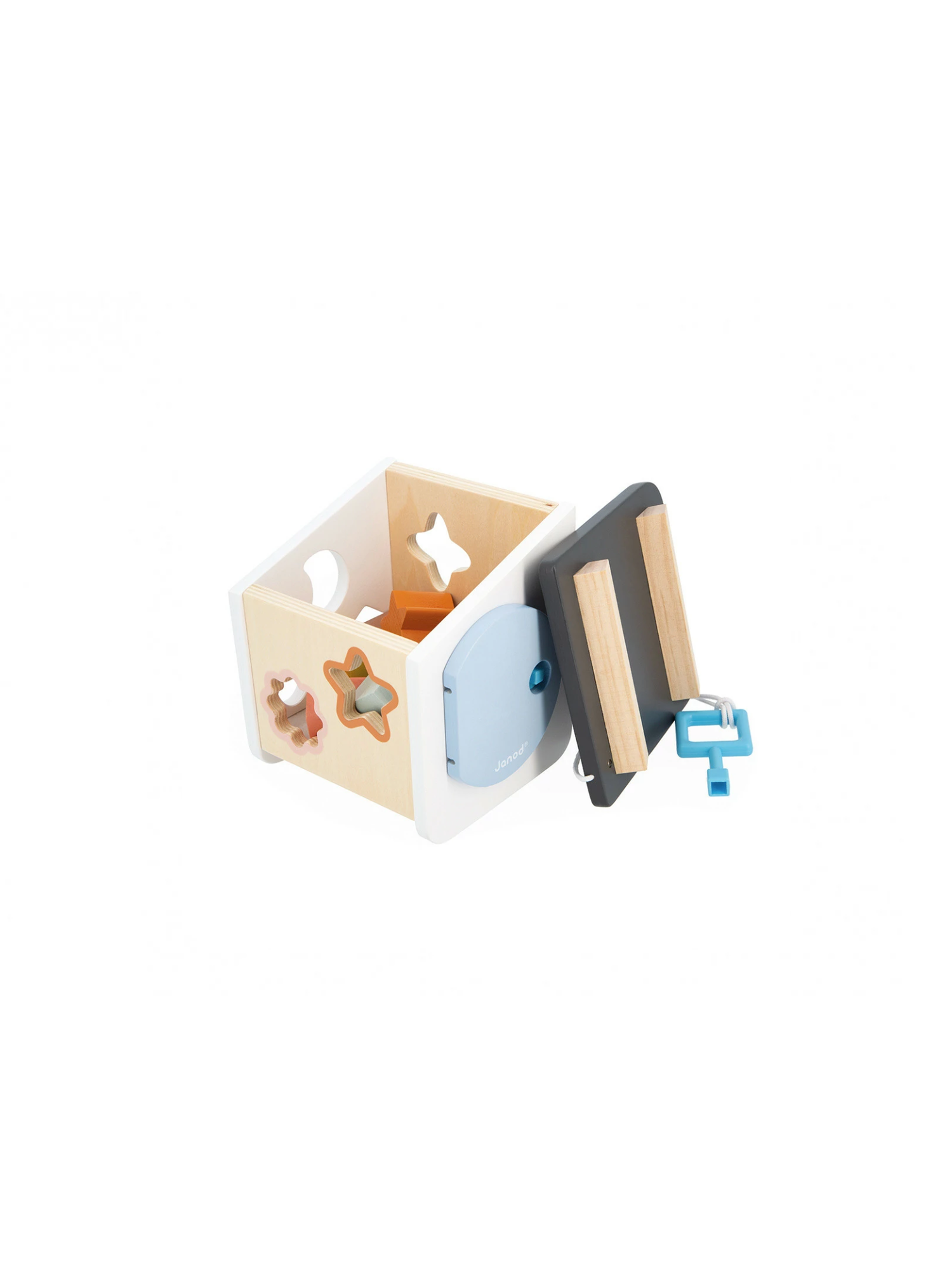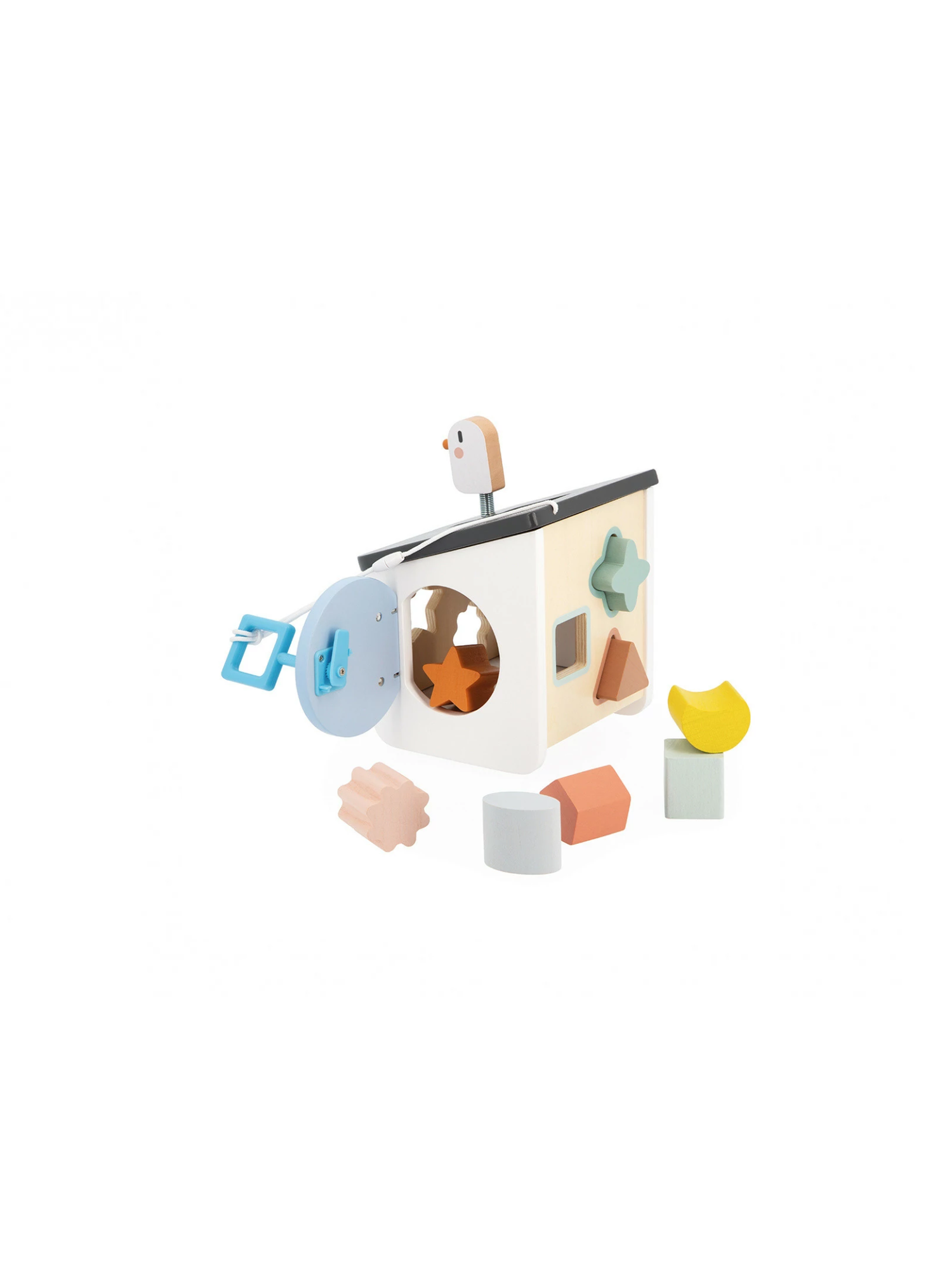 ¿Caja de formas o caja con llave? ¡Qué delicia! La otra ventaja de este juguete de primera infancia es el fieltro que cubre el fondo de la casita para amortiguar el ruido de las piezas al caer. Ternura es la palabra clave de este juguete de actividades: madera natural y fieltro, colores atemporales, un adorable pájaro… Es un juguete para bebés completo y duradero, que le enseña a manipular y encajar objetos.