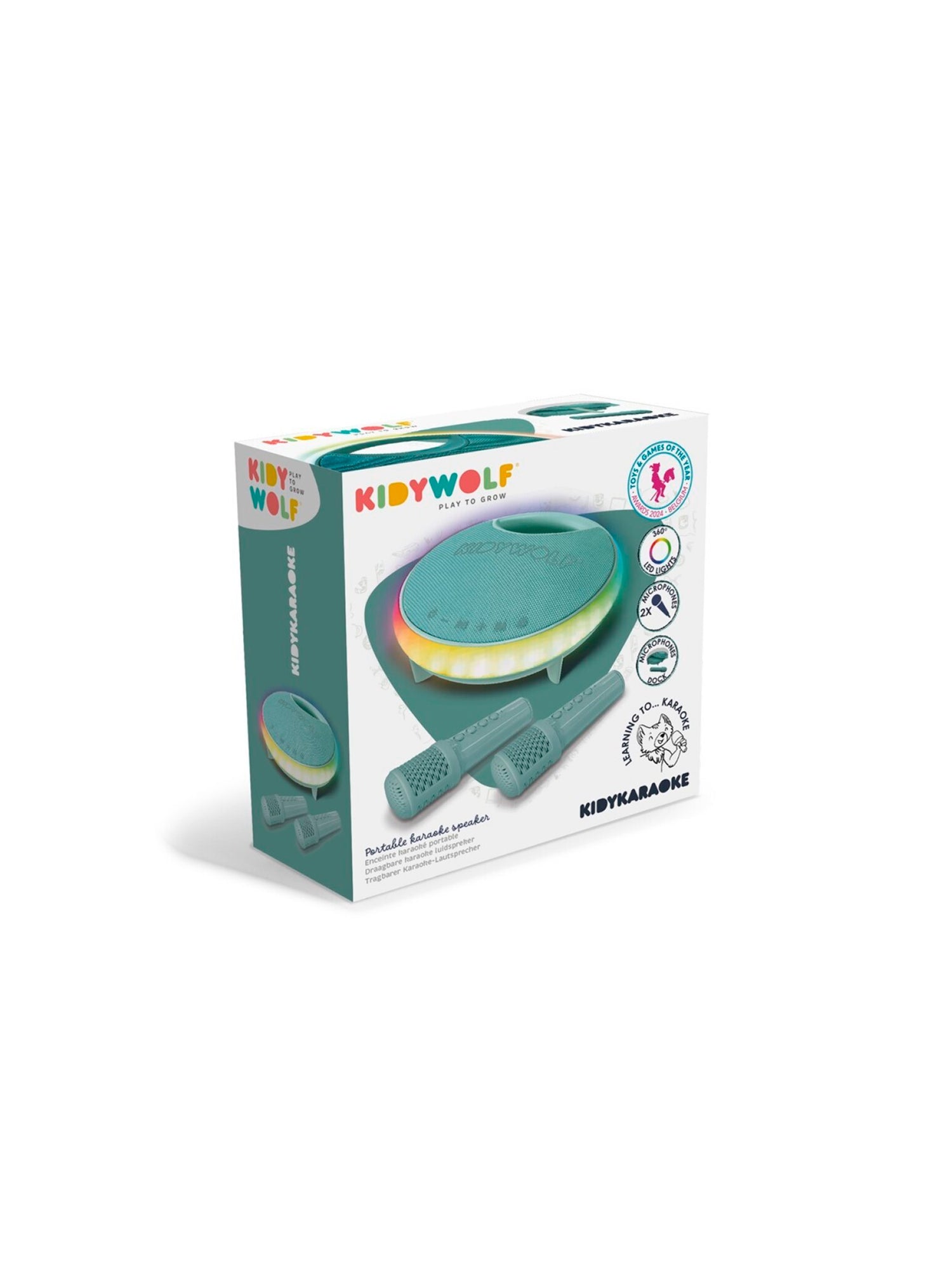 Equipado con dos micrófonos inalámbricos y funciones divertidas, este altavoz convierte cualquier lugar en un escenario de espectáculo. Con su altavoz de 40W y sus variados efectos de sonido y luz, KIDYKARAOKE es el compañero ideal para tus veladas, ya sea que estés en casa o de viaje.