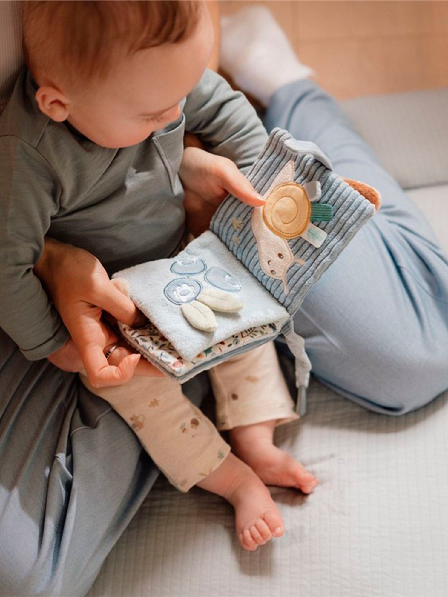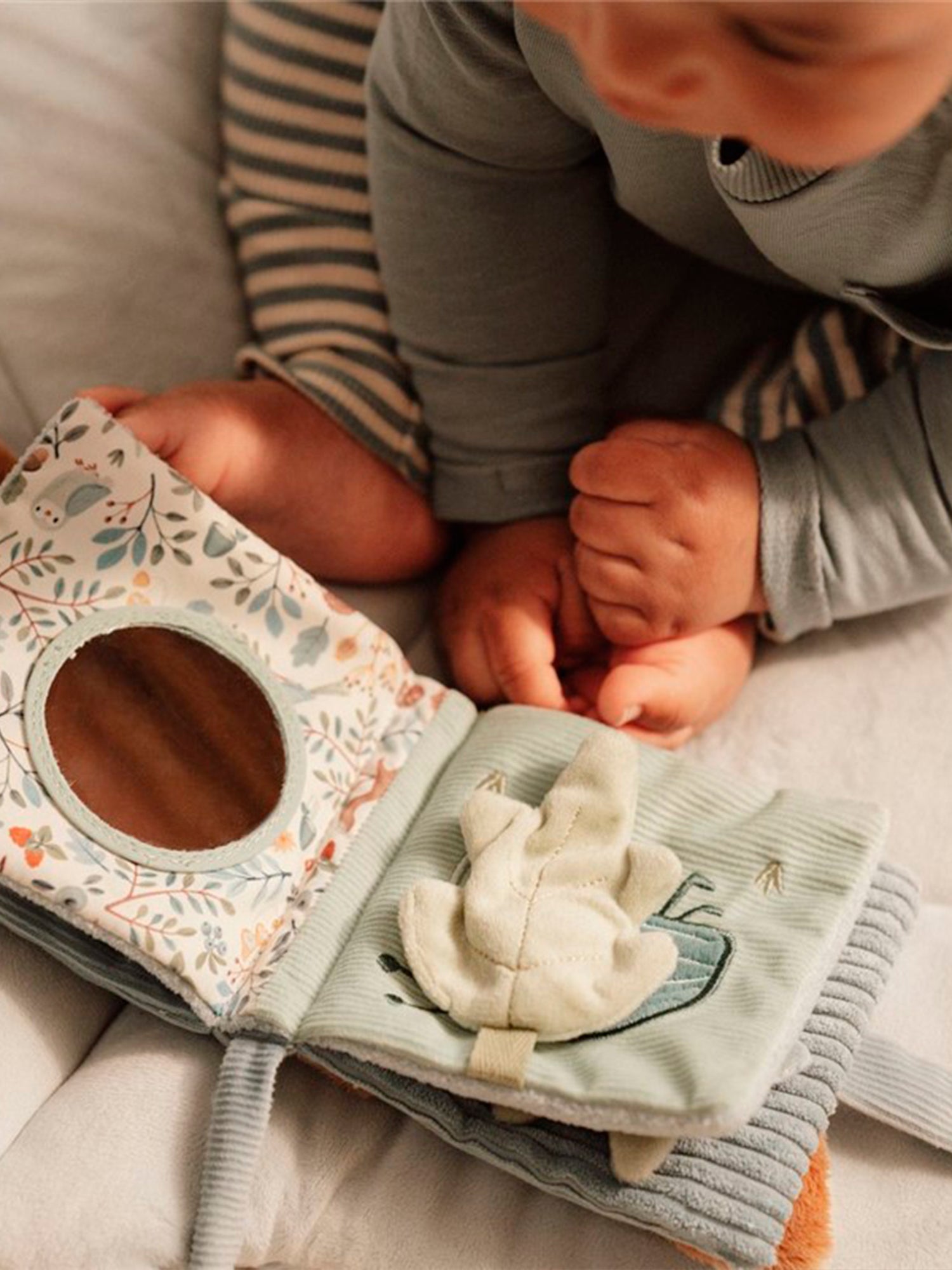 El libro blando Forest de Little Dutch contiene diferentes dibujos bordados con colores suaves.