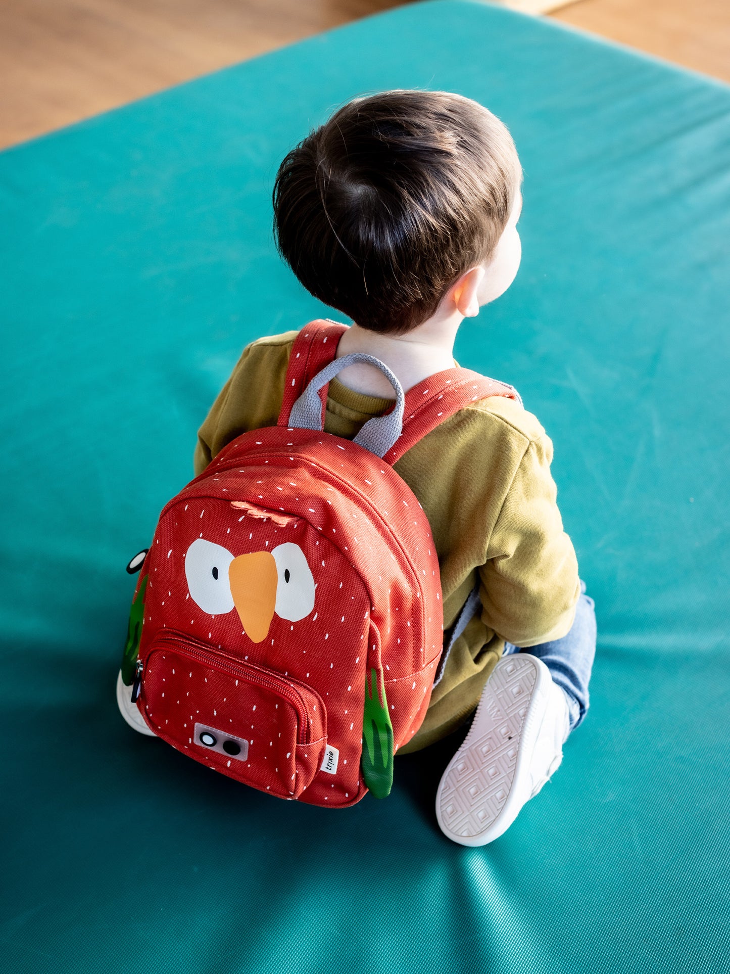 Mochila con cara de loro y bonitas alas y cresta. Perfecta para el colegio, la guarderia o para ir de excursión.