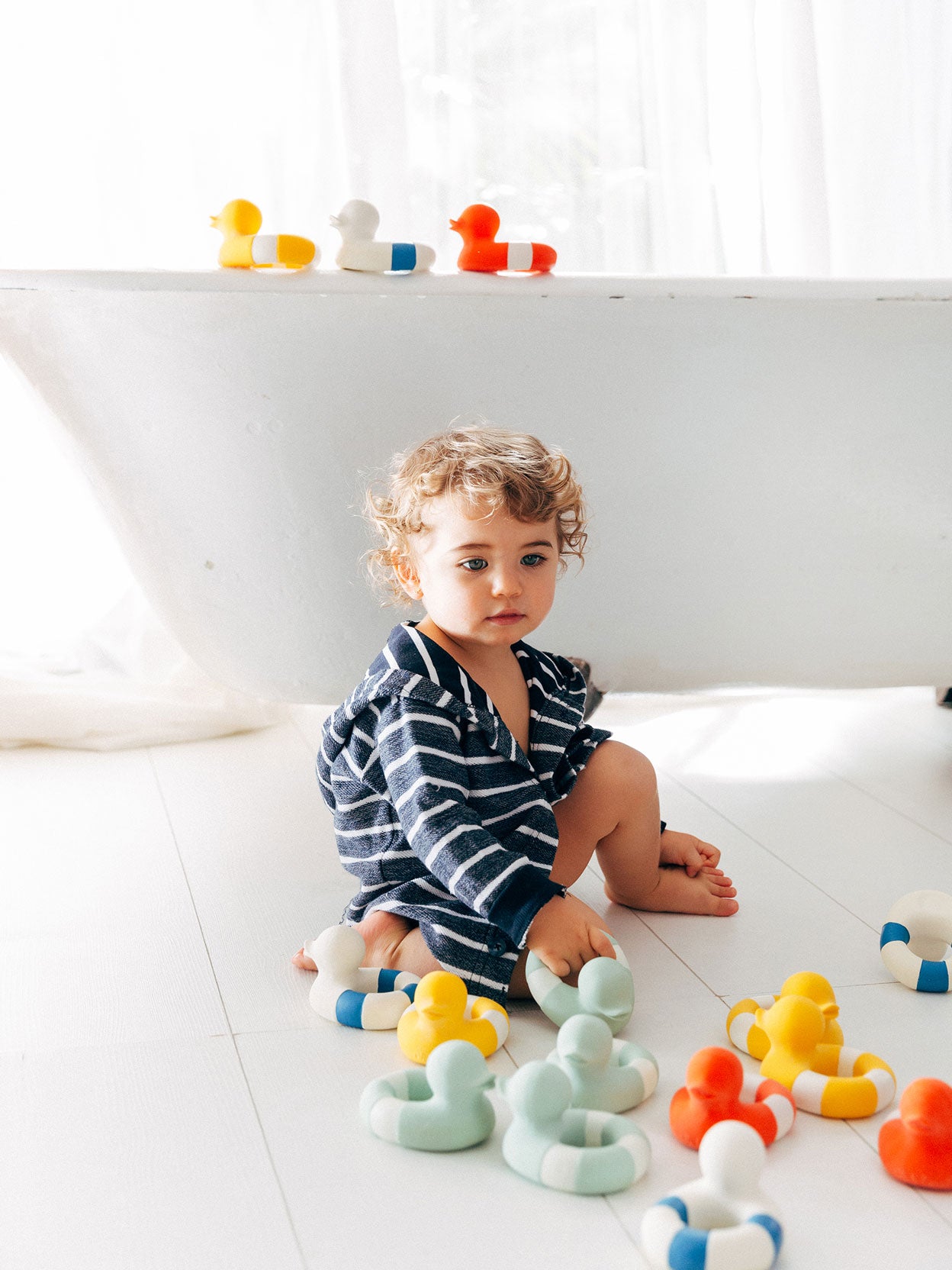 El patito flo the floatie es un mordedor, juguete de baño y juguete sensorial para bebé.