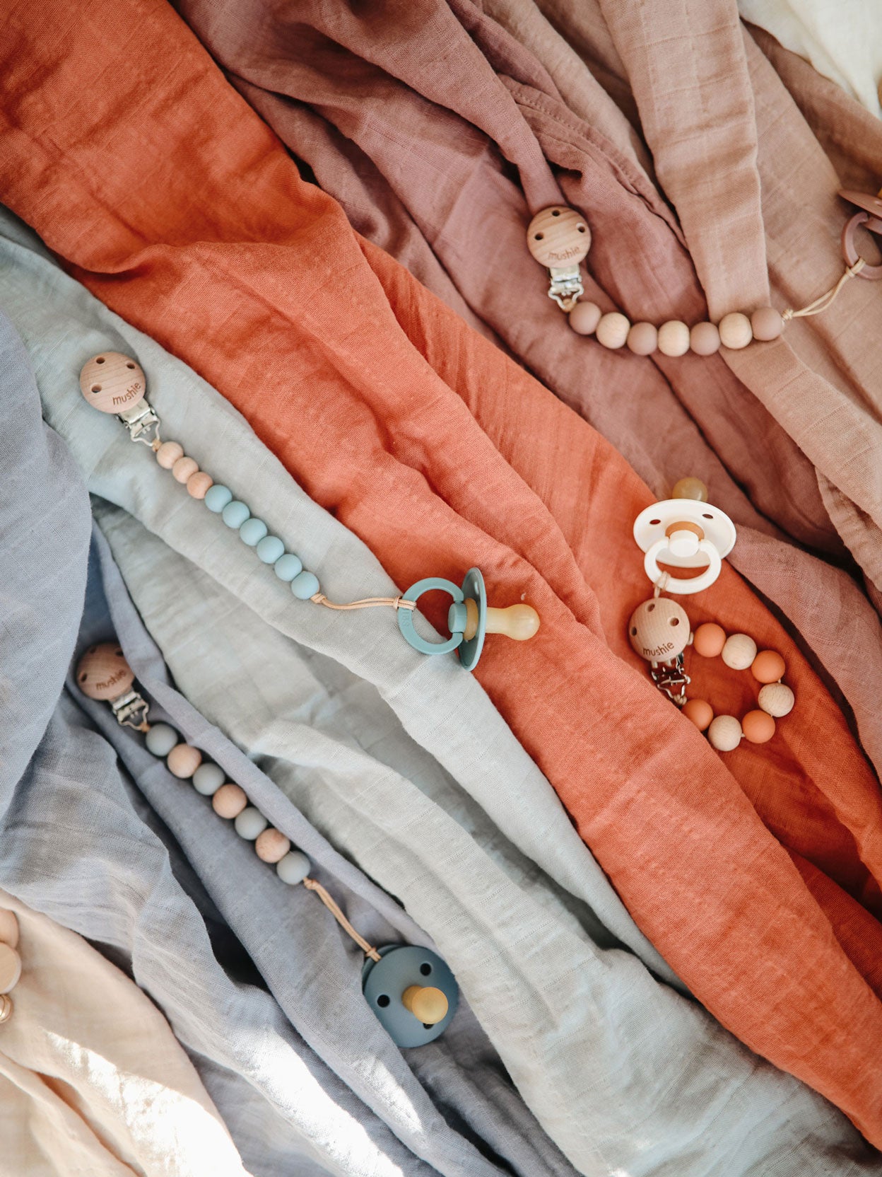 Mushie es una marca que diseña y fabrica en Dinamarca. Sus productos son sotenibles fabricados con materiales eco-concientes que duran mucho. De diseño minimalista Mushie es conocida por sus famosos porta chupetes de silicona, baberos de silicona o muselinas de algodón orgánico.