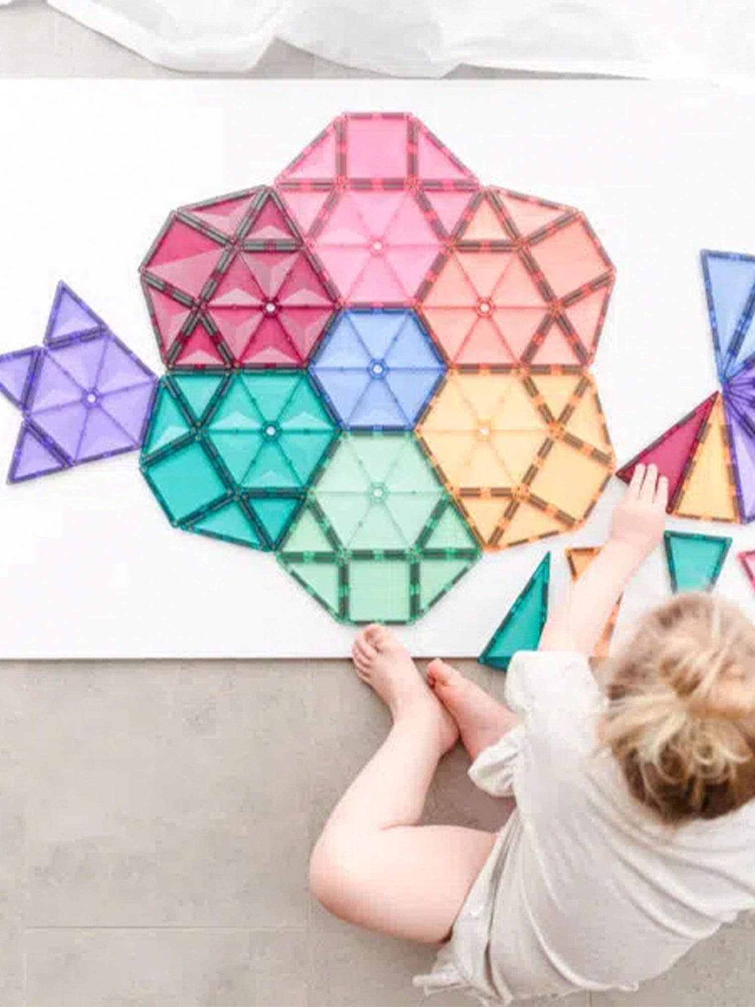 Las piezas se pueden superponer y crear nuevos colores. También son geniales para jugar con ellas en la mesa de luz o en una ventana con los rayos de luz.