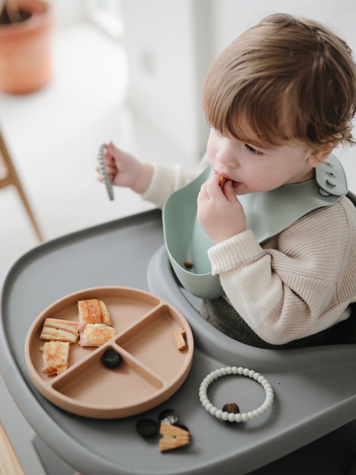 Este plato con compartimentos Mushie de silicona cuenta con una ventosa que lo mantiene en su lugar, minimizando los derrames mientras tu peque aprende a comer solo. El material de silicona de grado alimenticio te permitirá calentar alimentos de manera segura directamente en el recipiente. Perfecto para comenzar con el blw o alimentación complementaria, ya que evitará las caidas del plato.
