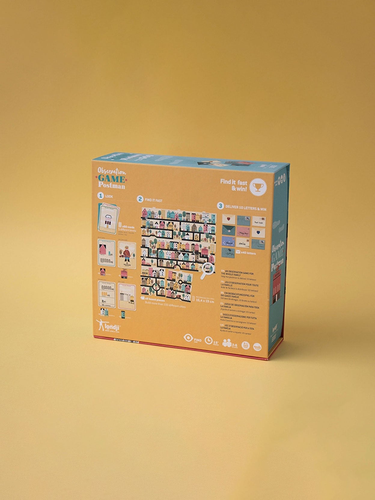 En este juego de observación tendrás que ser el cartero más rápido de Londji. Un juego familiar con 5 niveles de dificultad. Desde los 4 años. Un juego sostenible.