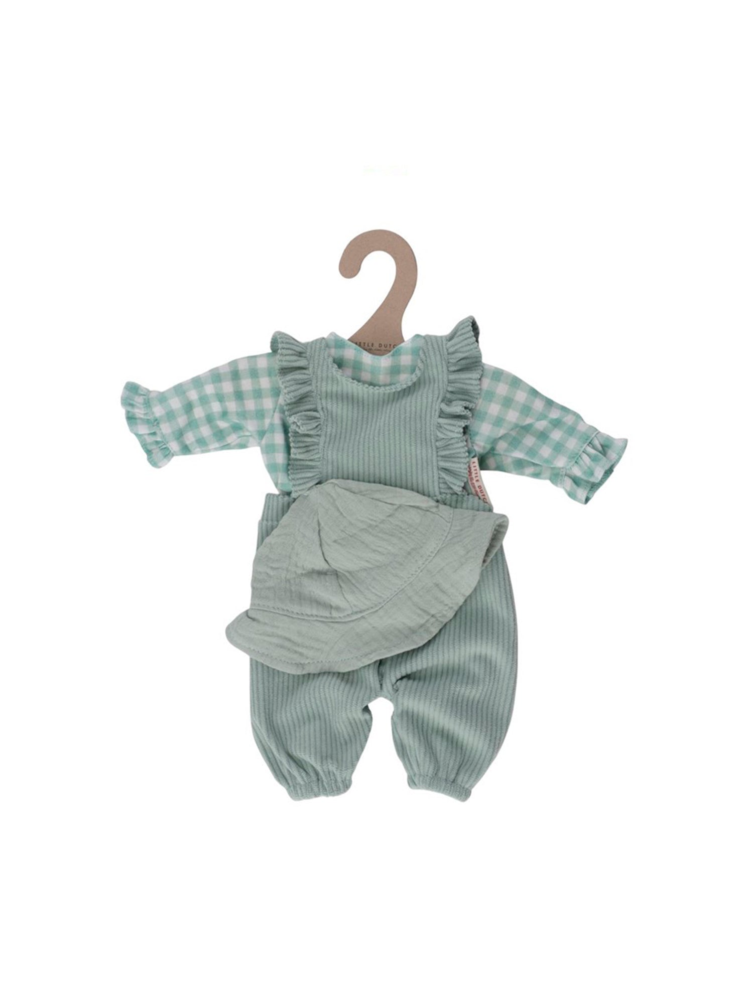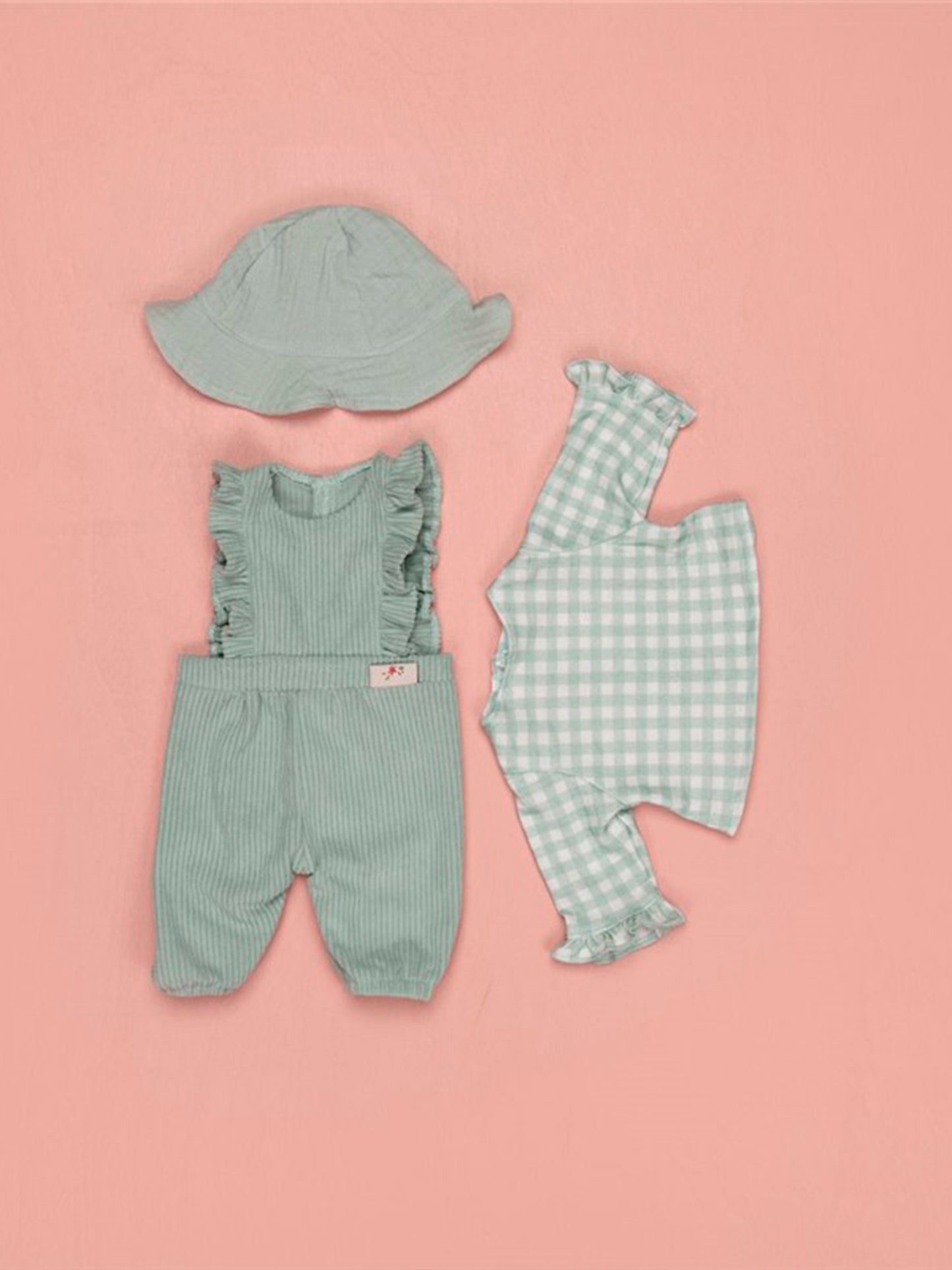 ¿Qué vestirá tu muñeca hoy? Este encantador conjunto es perfecto para vestir a Lily y Noa para una tarde de paseo. Disfruta vistiendo a tu muñeca favorita para un día lleno de aventuras y juegos. El conjunto presenta un mono con volantes en un tono verde suave unido a un cuerpo de manga larga con el diseño Fresh Green Check. Para completar este encantador conjunto, el juego incluye un lindo sombrero para el sol de color verde suave.