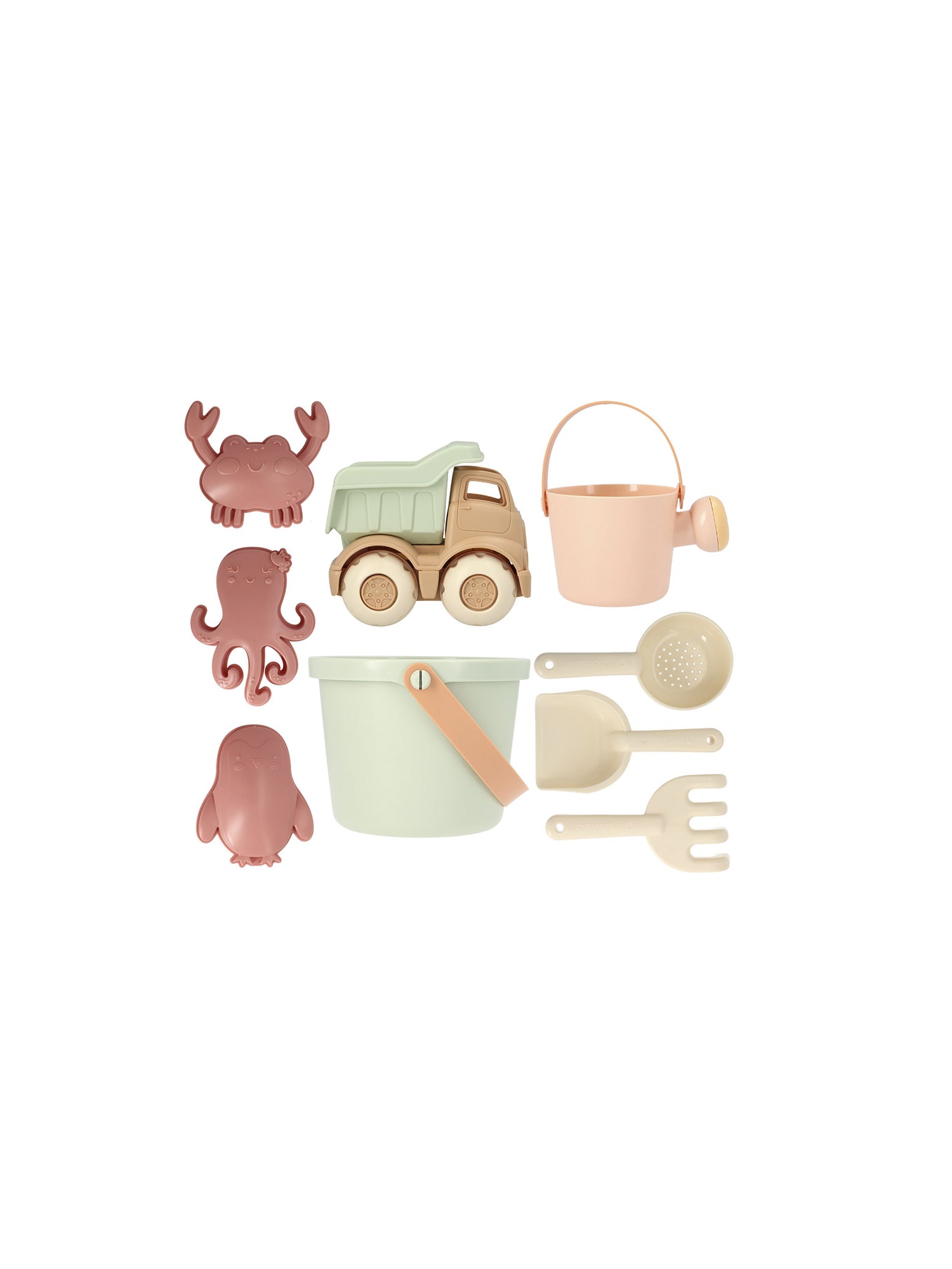 Completo set de Juguetes de playa cubo Sage, con un camión, para hacer las construcciones más apasionantes a la orilla del mar. El plástico es un poco flexible por lo que los jugutes son más blanditos que los de playa comunes. El camión es para jugar en la playa, no es un camión de rodaje.