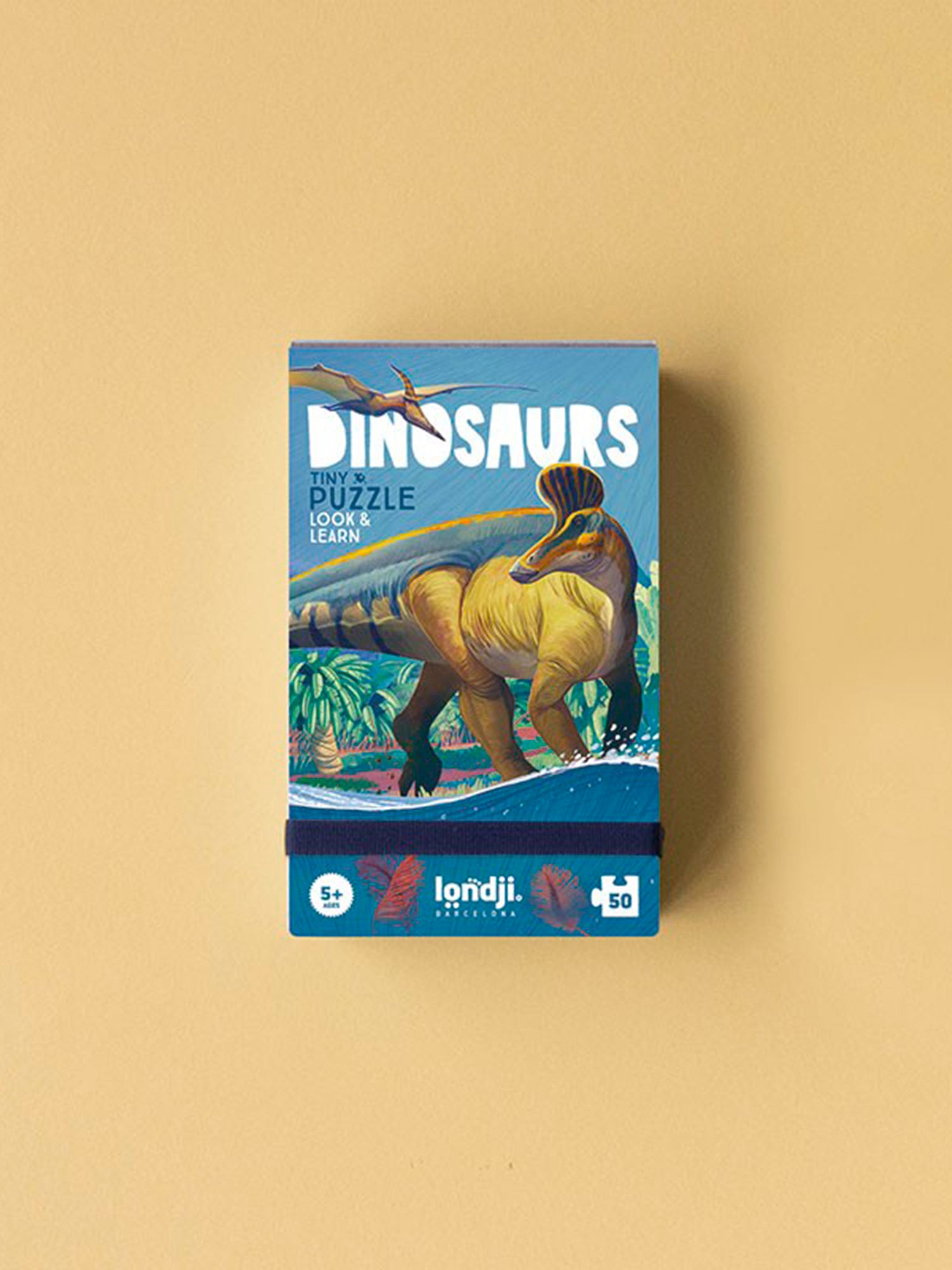 Un puzzle pequeño de 50 piezas que incluye 12 piezas para aprender sobre los dinosaurios. Un juguete educativo y sostenible.