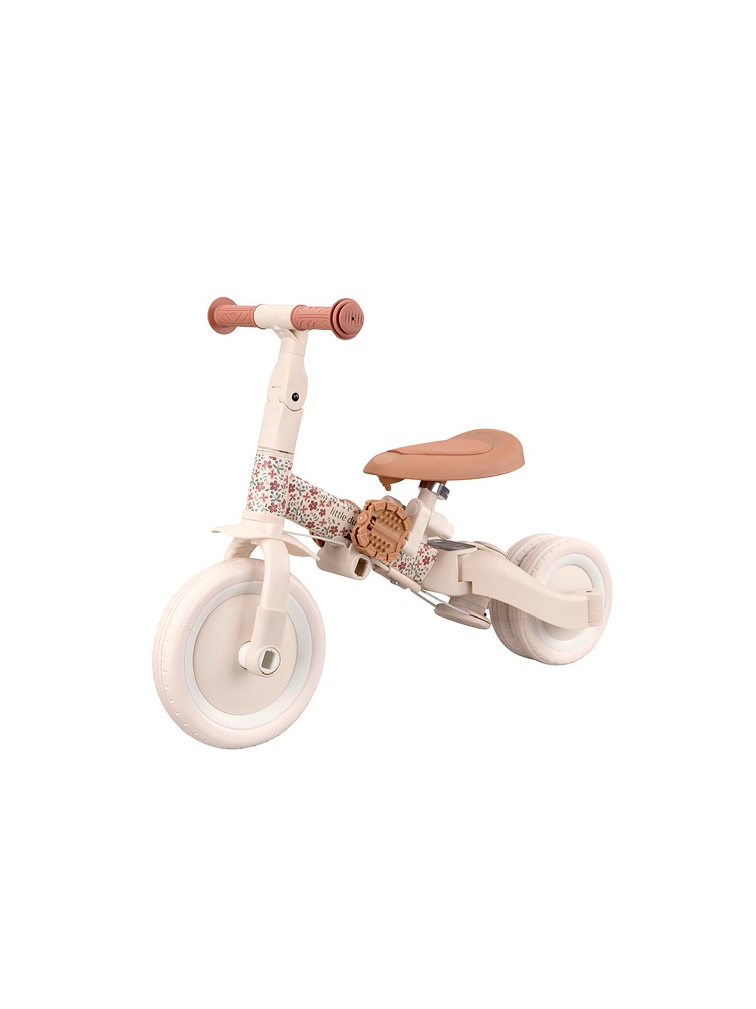 Este modelo es fácil de convertir de un triciclo a una bicicleta de equilibrio al plegar las dos ruedas traseras hacia adentro. Esto hace que la transición a una bicicleta con pedales sea más fácil. Los pedales son fáciles de montar y se almacenan cómodamente en el marco debajo del sillín. El sillín y el manillar son ajustables a las necesidades del niño.