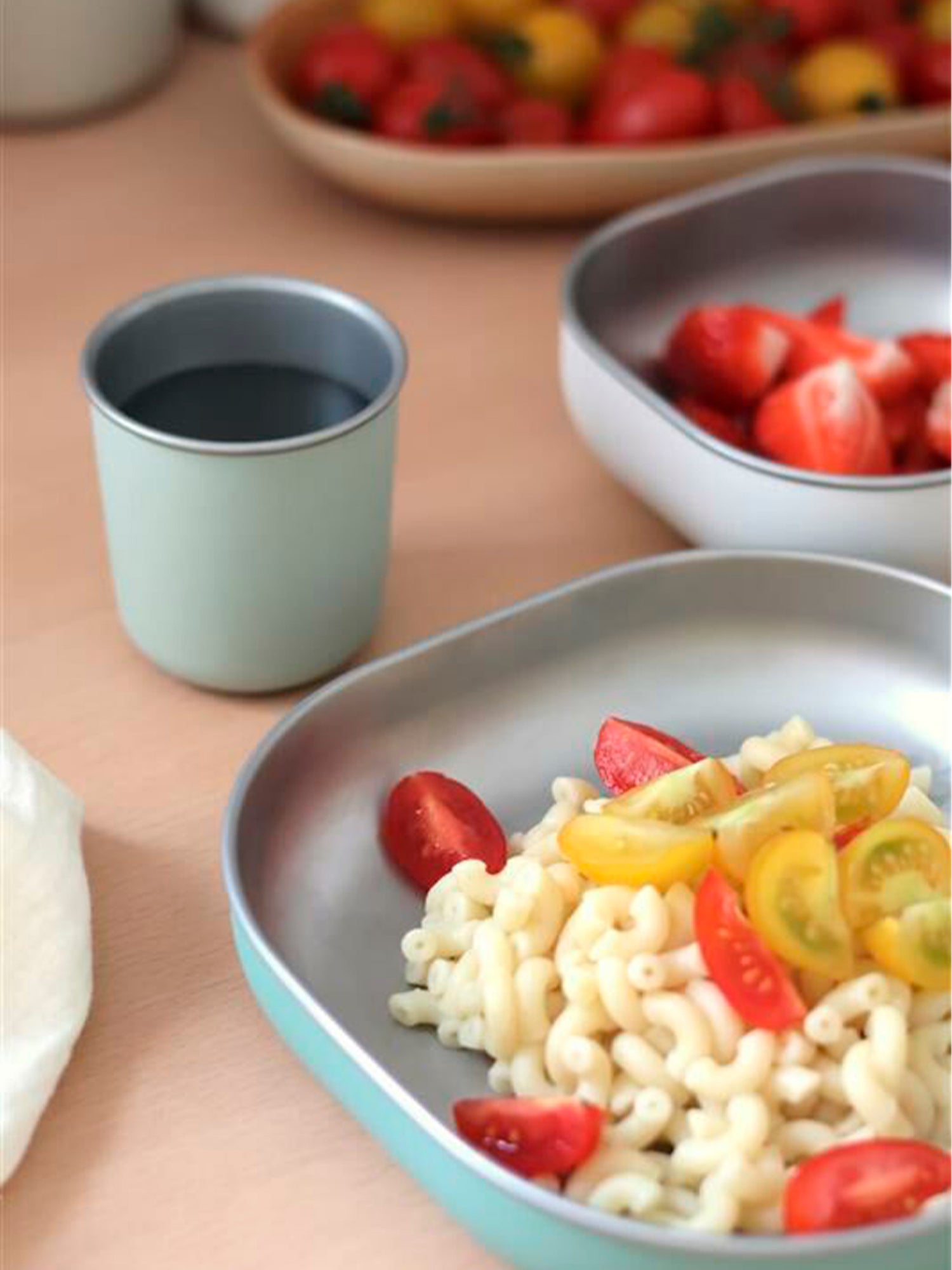Set completo: compuesto por plato ergonómico de acero inoxidable, bol y vaso pequeño