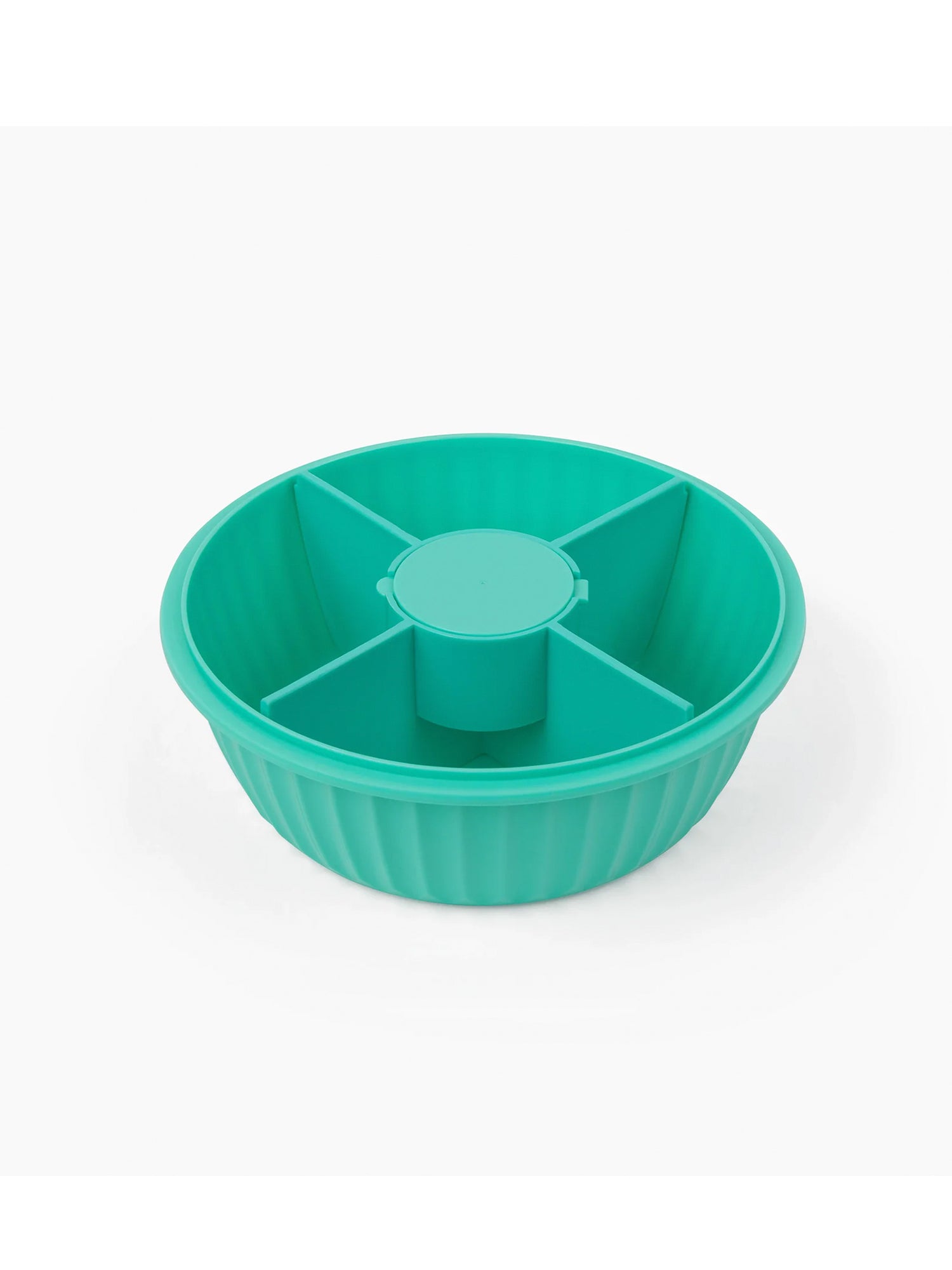 Dispone de 3 espacios para no mezclar diferentes alimentos y en la parte central un recipiente extraible para aderezo o salsa con tapa.