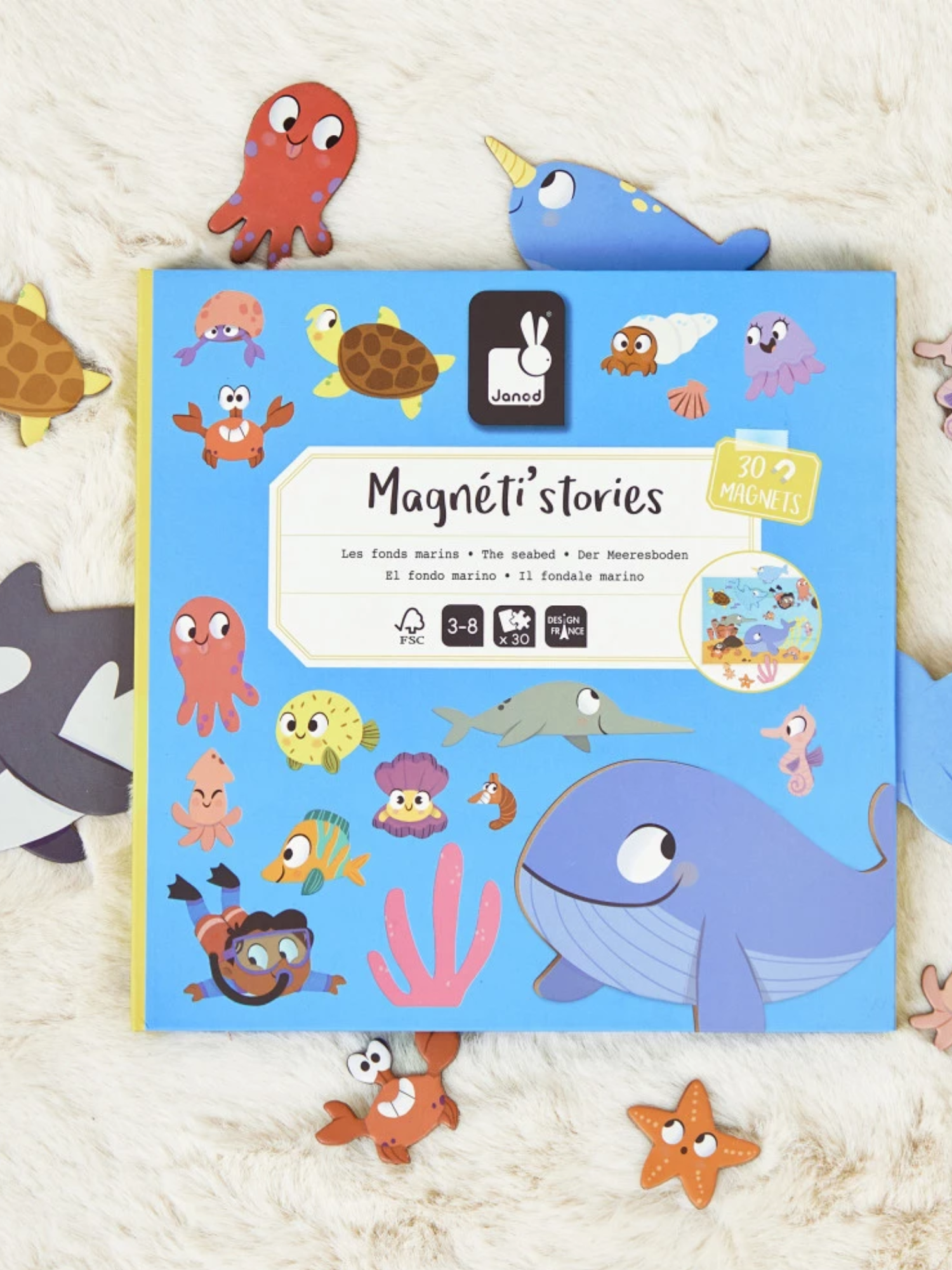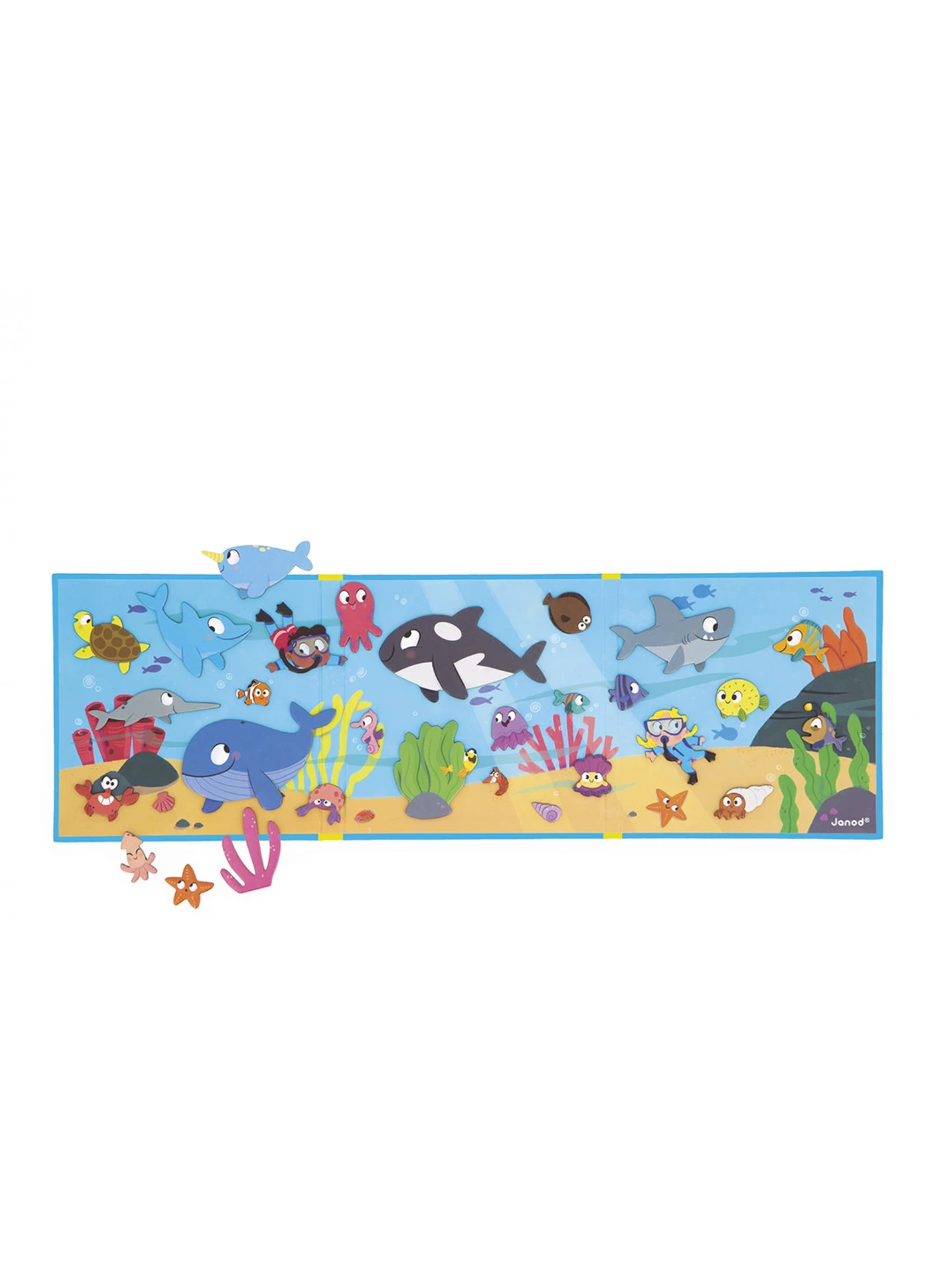 ¿Nos damos un chapuzón? Sus hijos podrán sumergirse en las profundidades del mar a partir de los 3 años con este juego magnético ilustrado con peces y mariscos.