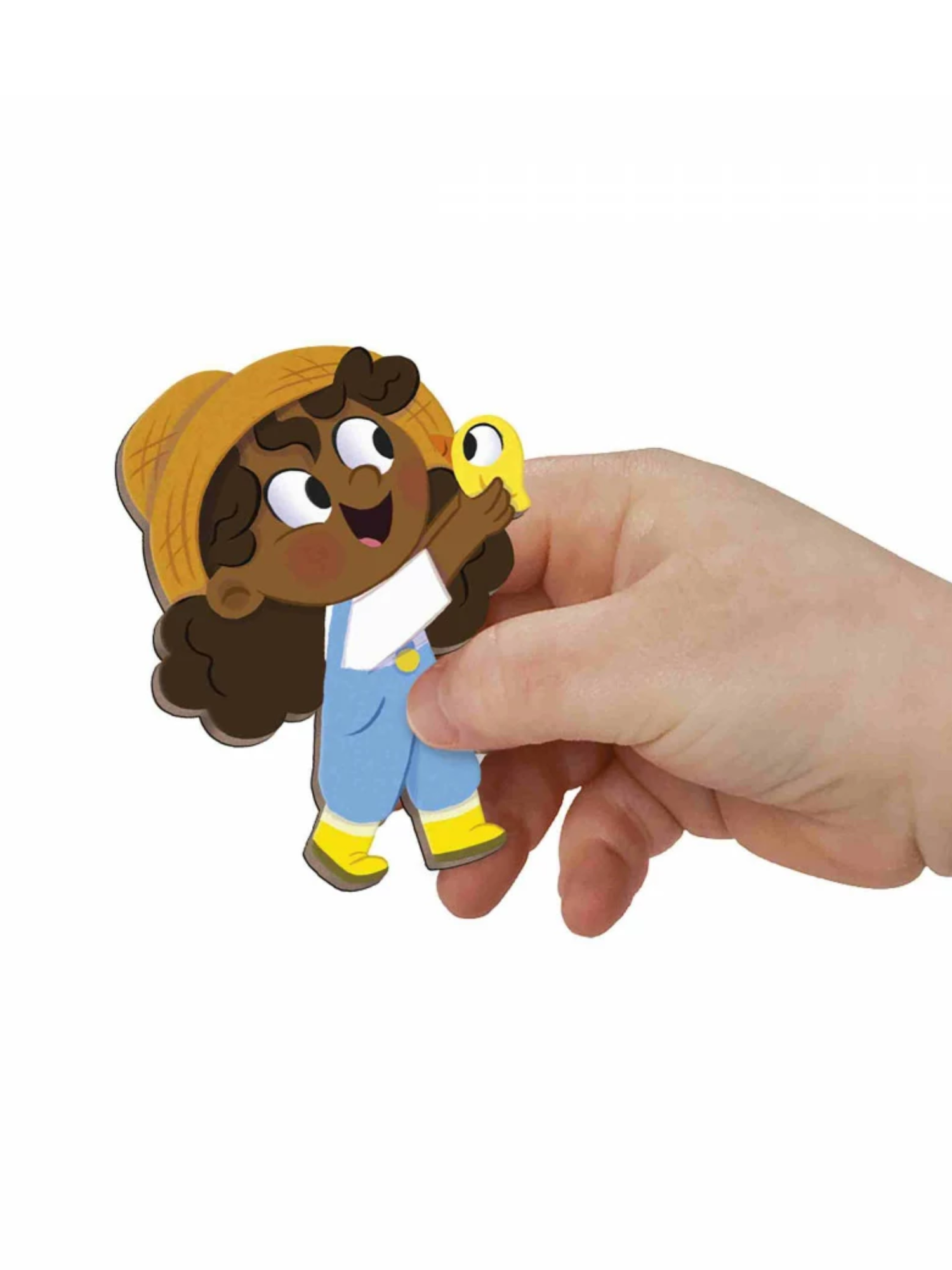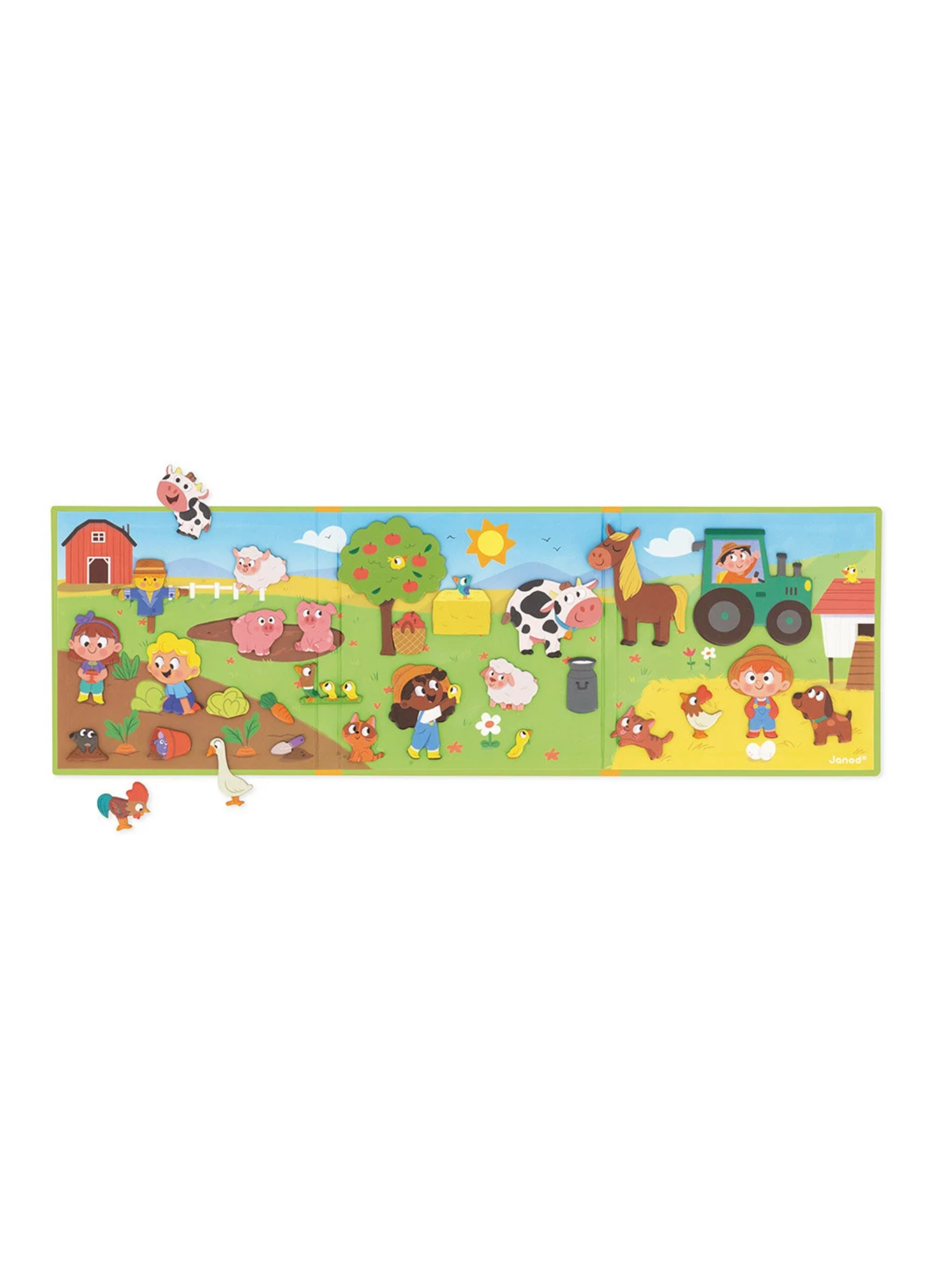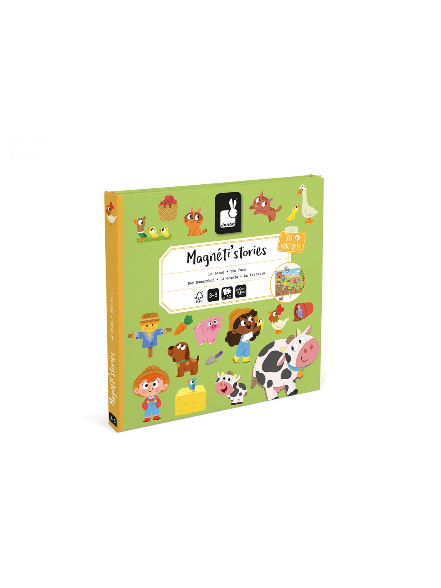 Este juego magnético consta de un decorado magnético y 30 imanes. La motricidad fina, fundamental en los primeros aprendizajes de los niños, se trabaja al agarrar las piezas magnéticas. La imaginación no se queda atrás: cada imán, una vez puesto en el decorado, invita al niño a inventarse sus propias historias. Los cerditos se revuelcan en el barro, las ovejitas saltan la valla, el granjero se va a cosechar subido en su tractor verde… ¡Un montón de divertidas escenas que cobrarán vida en la cabeza del pequeño! ¡Y es genial porque el decorado se puede poner en vertical para que el niño te cuente sus historias!