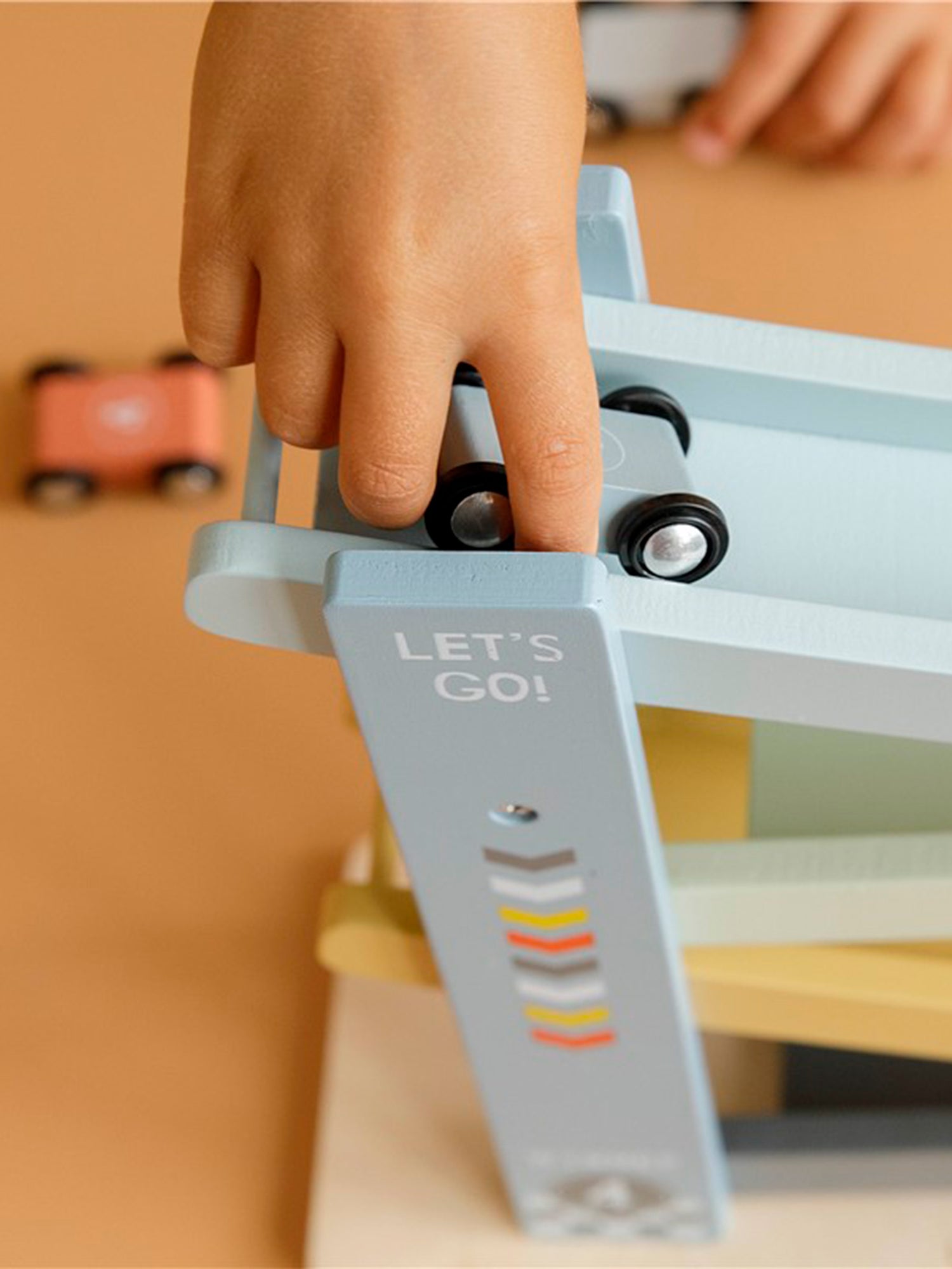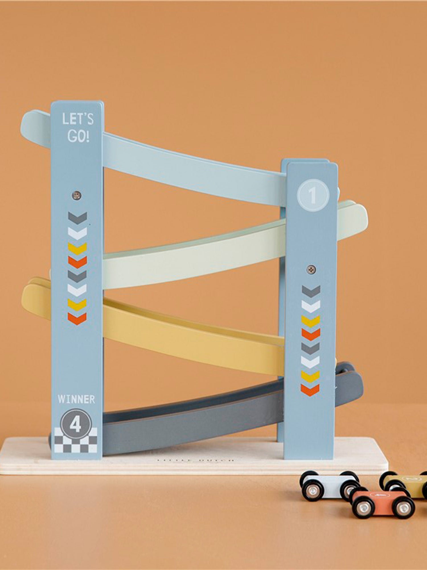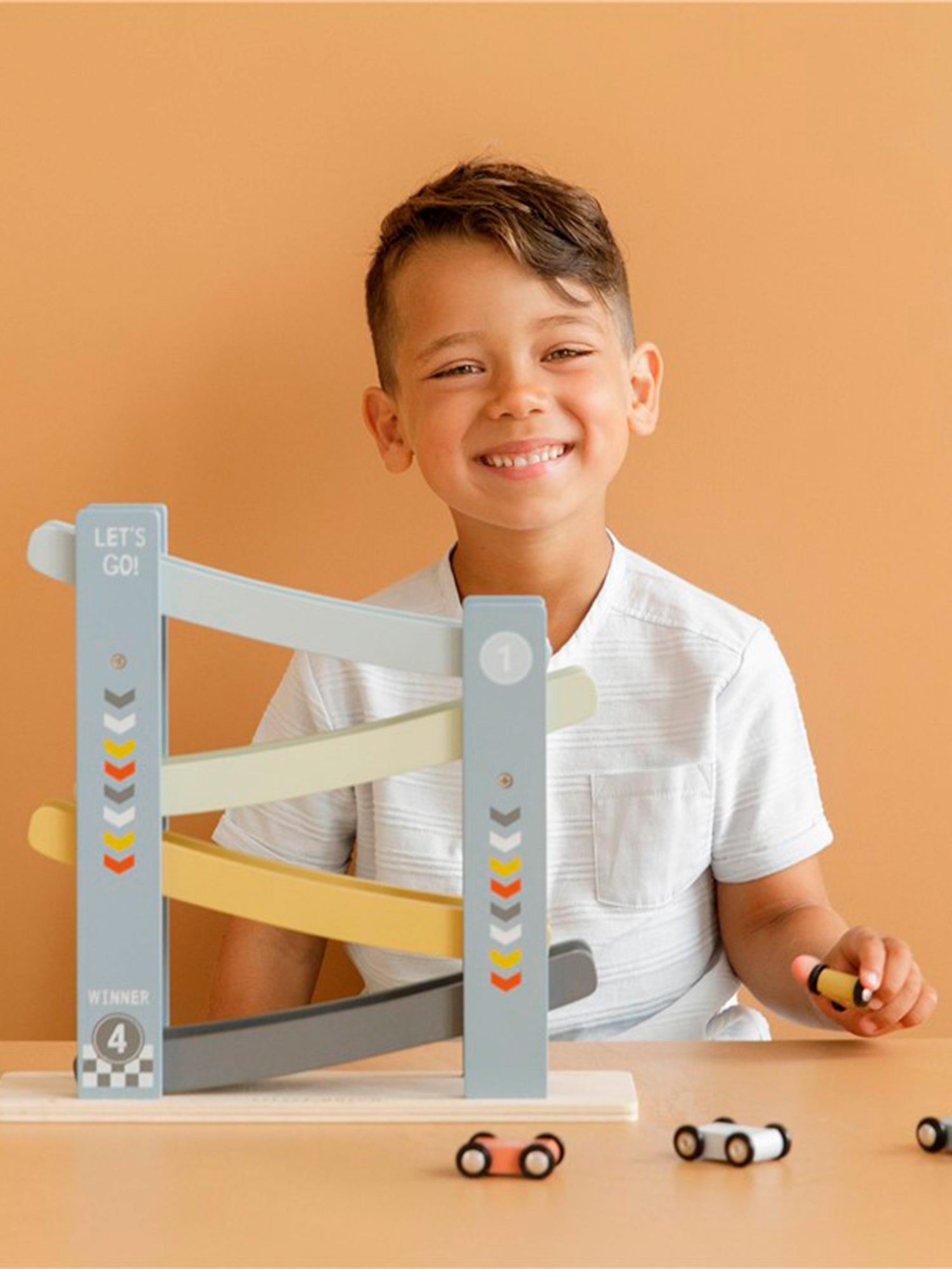 1,2,3 feito! Seu pequeno vai se divertir muito com esta alegre pista de corrida de madeira, que inclui 4 carros. Coloque os carros no topo da pista de corrida um por um, solte-os e eles descerão.